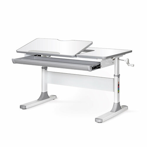 Высота стола плавно регулируется с помощью механической ручки, которая может располагаться как с левой стороны основания стола, так и с правой, что дает возможность легко настроить парту под рост ребенка.