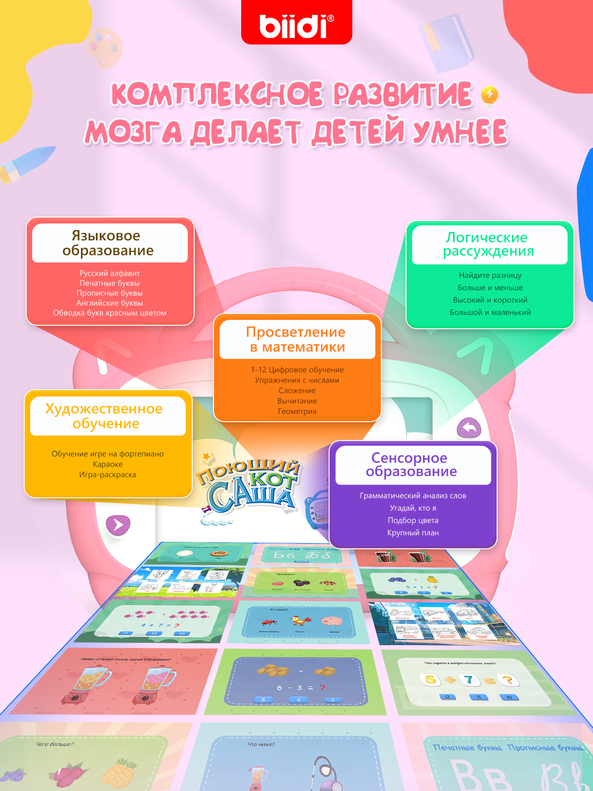 4 - Развивает у ребенка наблюдательность, мышление, сравнительный анализ и пространственное восприятие. Кот Саша может самостоятельно научить вашего ребенка распознавать письменную и рукописную форму каждой буквы и научить писать их в правильном порядке. Кот Саша использует метод Монтессори для изучения слов и грамматики в 15 категориях: животный мир, транспорт, овощи и фрукты, спорт и т. д. В отличие от обычного обучения по карточкам, где требуется, чтобы родители читали слова, кот Саша может произносить слова, а ребенок может повторять за ним и самостоятельно обучаться. Приобретение "Кота Саши" равносильно покупке более 20 наборов обучающих карточек с более чем 1 000 учебных тем. Кот Саша - это видеоплеер, интерактивная игрушка-караоке, интерактивное электронное пианино. Кот Саша имеет множество других функций, эта детская развивающая игрушка доставит много радости детям и родителям! Прекрасный подарок для мальчиков и девочек на Новый год, день рождения, день защиты детей.