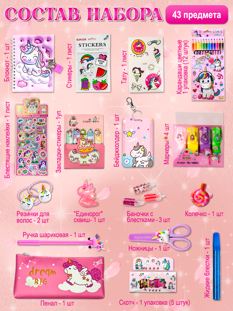 Канцелярский бокс «Единорог» — большой, модный и оригинальный набор канцелярии, созданный специально для девочек. В этот интересный канцелярский бокс входят популярные и удобные канцелярские принадлежности — отличный выбор как для учебы, так и для творчества. В составе набора — стильный школьный пенал, который поможет удобно хранить все аксессуары и школьные принадлежности. Пенал-рюкзак — функция и эстетика в одном, идеально подходит для первоклассника, учеников начальных классов, подростков и даже выпускников детского сада. Этот набор канцелярии является идеальным подарком для девочки на день рождения, Новый год или любой другой праздник. Новогодний бокс с канцелярией — отличный сюрприз и оригинальный подарочный набор, который придется по душе как школьникам, так и молодежи. Милая и эстетичная канцелярия из набора «Единорожка» — популярные школьные принадлежности, которые сделают учебу и творчество еще интереснее. Такой большой канцелярский набор — отличный способ подарить ребенку стильные, удобные и оригинальные аксессуары, которые точно понравятся и мотивируют на новые успехи! Идеальная покупка для детей 5,6,7,8,9,10,11,12,13,14 и 15 лет младших, средних и старших классов.