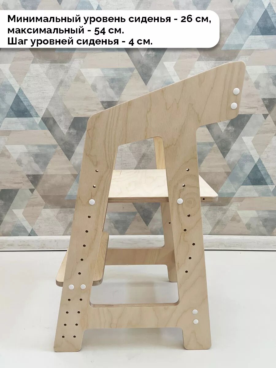 Изготовленный из первоклассной березовой фанеры, наш детский растущий стул отличается прочностью и безопасностью. Он идеально подходит для детей от 1 года и легко регулируется по мере роста ребенка. Регулируемое сиденье и подножка позволяют настроить стул под индивидуальные потребности вашего малыша, способствуя правильной осанке и удобству во время занятий, игр или приема пищи.