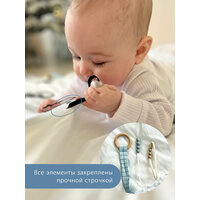 Что можно потрогать на монтессори-коврике: лепестки шуршащие, силиконовый грызунок, деревянное колечко, пластиковые бусины, ленты различных текстур, контактная лента, металлическое кольцо, буковые и можжевеловые бусины, шуршащий гребень.