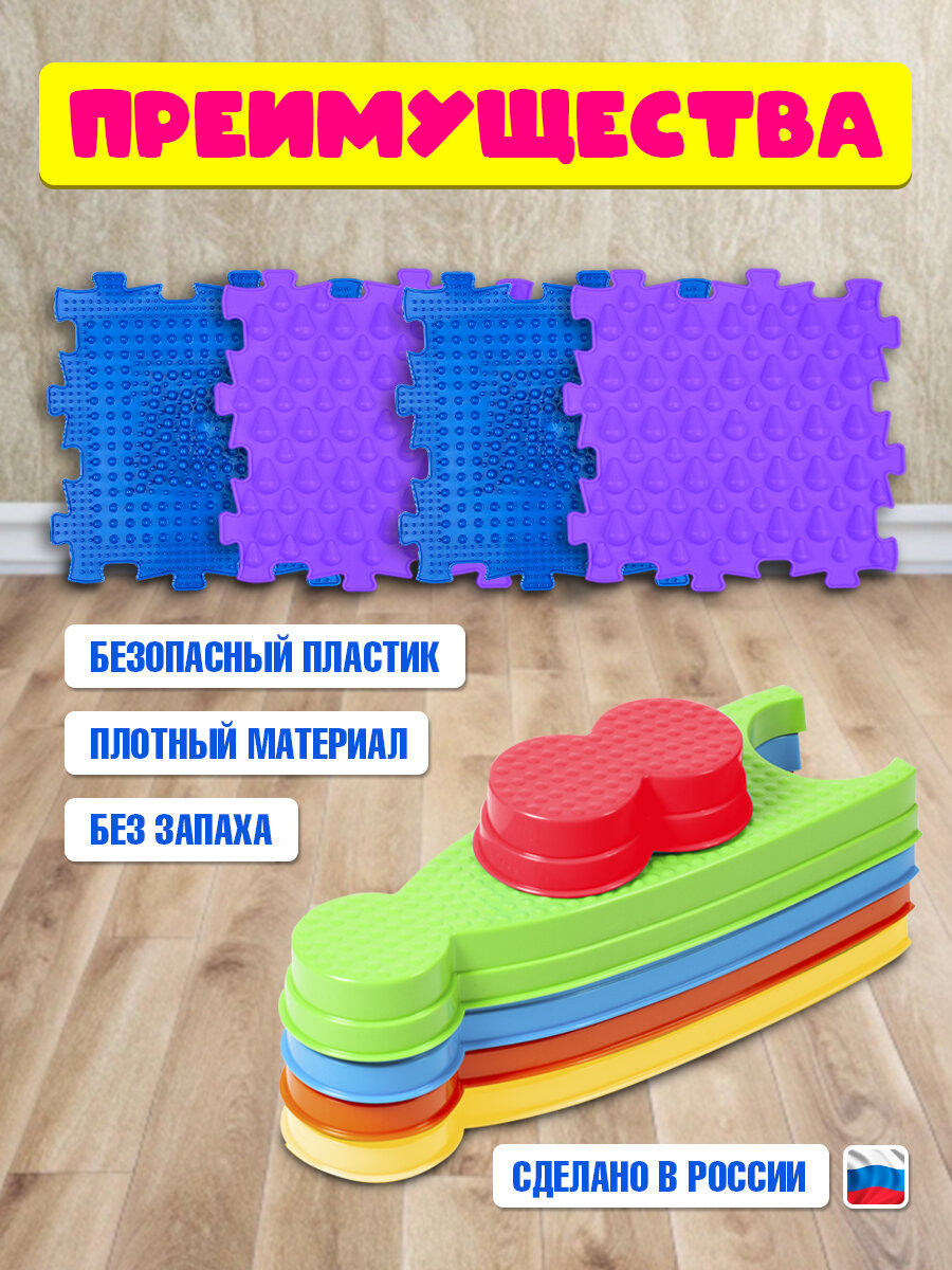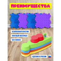 Напольный массажный коврик пазл обеспечивает комфорт и пользу для детей и взрослых. Массажный коврик для ног включает в себя панели размером 24,5*24,5 см, и 2 разнообразные фактуры: пузырьки и ракушки, которые легко соединяются между собой как пазлы. Акупунктурный игровой коврик изготовлен в России из качественного ПВХ, отличается прочностью и долговечностью, а его сенсорные свойства способствуют правильному формированию ножки у малышей. Он станет хорошим дополнением детской комнаты, а также поможет в профилактике плоскостопия и укреплении ножек ребенка.