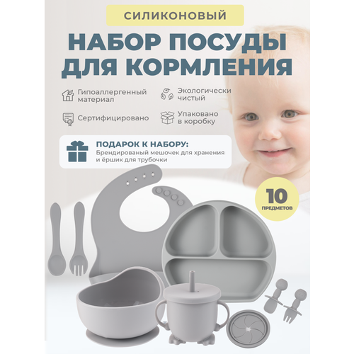 Силиконовый набор посуды для кормления детей с 4 месяцев до 7 лет. Набор состоит из 10 предметов, а именно: поильник, крышка с трубочкой для поильника, глубокая тарелка на присоске, нагрудник с кармашком, тарелка с тремя секциями на присосках, вилка и ложка, дополнительная крышка, вилка и ложка с ограничителем. Посуда выполнена из качественных и нетоксичных материалов. детская посуда для кормления, детская посуда для кормления набор, Слюнявчик силиконовый (фартук) имеет регулировку для изменения размера на шее, а так же карман для остатков пищи, который сохранит одежду ребенка чистой. Суповая тарелочка имеет высокие борта и присоску, для надежной фиксации к поверхности стола, что исключает опрокидывание тарелки. Кружка непроливайка подойдет для горячих и холодных напитков; стакан удобной формы, миска с секциями для еды, вилочка и ложечка для каши с нескользящей ручкой помогут быстро научить пользоваться приборами для самостоятельного питания ваших маленьких новорожденных мальчиков и девочек. Набор детских столовых приборов для прикорма компактный и не займет много места на кухне, легко складывается, не деформируется, его удобно взять с собой в поездку или на природу. Комплект для кормления отличный подарок молодой маме на выписку из роддома, рождение ребенка.