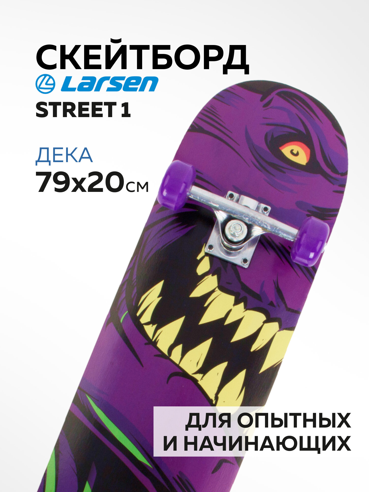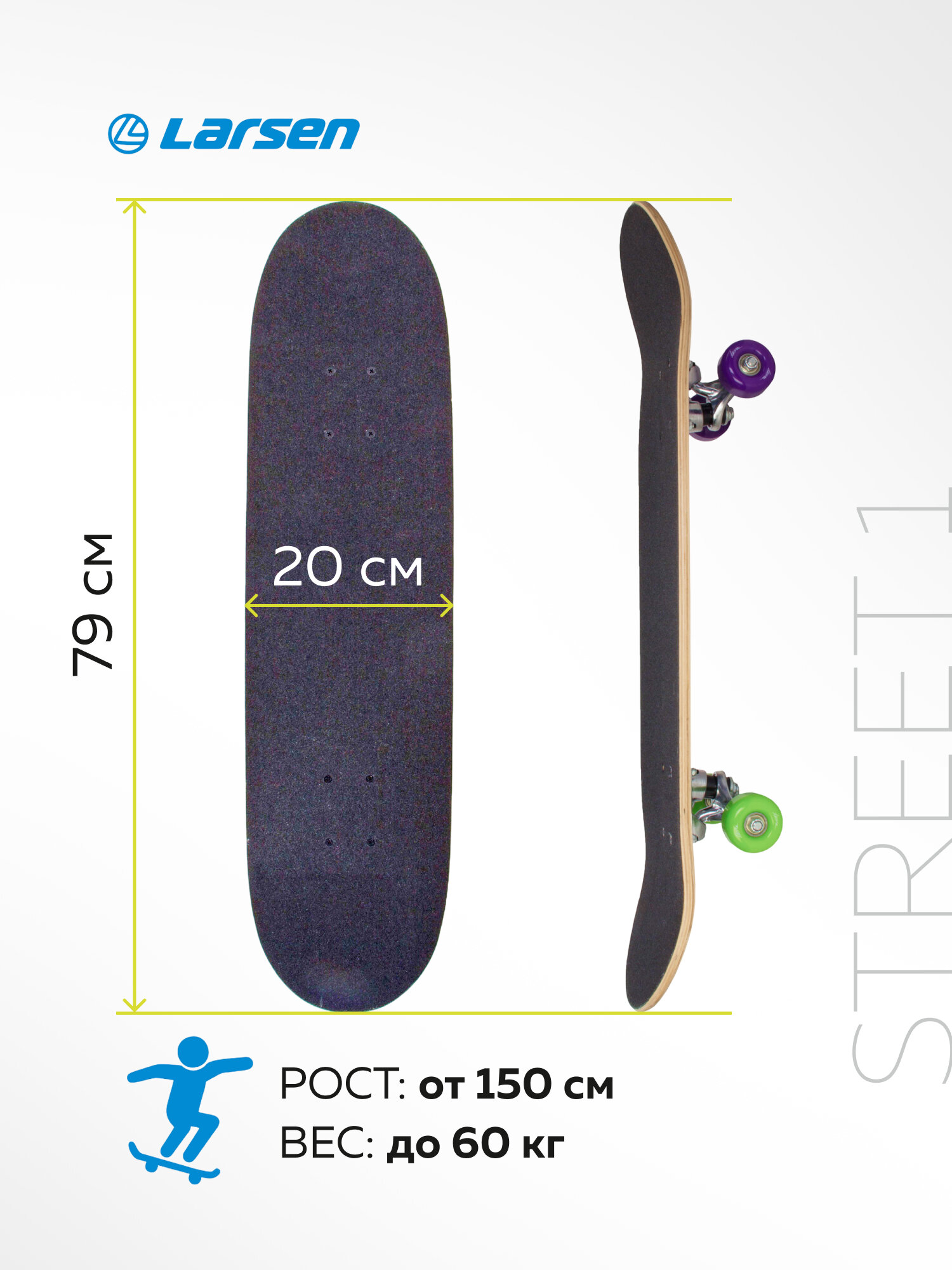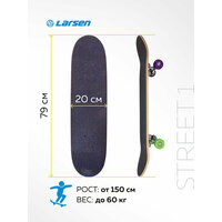 Larsen STREET 1 – отличный скейт для начинающих райдеров, которые хотят освоить технику катания и обрести базовые навыки. Скейтборд для подростков Larsen STREET отличается легкостью и маневренностью. Доска спроектирована для новичков и любителей, которые только осваивают премудрости скейтбординга. Если вы хотите приобрести скейт борд детский, обратите внимание из какого материала изготовлена дека. Дека для скейта – это основная часть доски, она должна быть выполнена из качественного материала и выдерживать заявленную нагрузку при эксплуатации. Многие породы древесины легко ломаются, повреждаются, быстро изнашиваются и деформируются. Клен – лучший выбор для изготовления деки, так как эта порода очень прочная и легко поддается обработке, выдерживает экстремальные нагрузки и не подвержена деформации. Борд Larsen STREET изготовлен из 9-слойного китайского клена. Максимальная нагрузка, рекомендованная для данной модели, составляет 60 кг. Данный скейтборд не входит в категорию скейтборд взрослый, скейтборд трюковой, скейт парк, круизер борд. Доска для скейтборда укомплектована колесами из полиуретана, отличающимися износоустойчивостью и ударопрочностью. Размер колес 52 x 30 мм, жесткость 82А. Амортизаторы из ПВХ довольно жесткие, что положительно влияет на управляемость доской. Это немаловажный фактор в скейтах для начинающих, новички получают возможность максимально контролировать процесс при движении. Яркий универсальный принт на поверхности доски найдет отклик у молодежи, поэтому модель можно использовать как скейтборд для девочек, скейтборд для мальчиков и скейтборд подростковый. Дополнительные технические характеристики Larsen STREET 1. Размер деки: 31"х 8" (79 х 20 см). Материал трака: алюминий. Размер трака: 5"(12,7 см), Тип трака- усиленный. Материал колес: полиуретан. Подшипник: ABEC-1, углеродистая сталь.