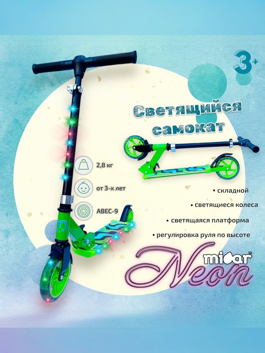 Детский складной двухколёсный самокат со светящимися колёсами и платформой Micar Neon 145 Зеленый: сравнение цен, характеристики, фото, актуальное наличие и цены.