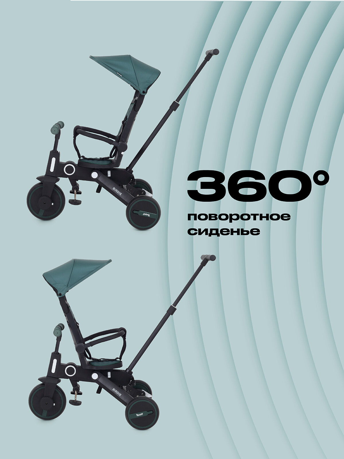 Система вращения сиденья на 360 градусов; Приводится в движение как родителем так и малышом; Легко и быстро складывается; Капюшон от солнца в комплекте; Возможность установки педалей как подставка под ножки; Мягкое сиденье с ремнями безопасности, регулируемыми по высоте; Тормоз на заднем колесе; Полиуретановые мягкие колеса; Рама: полипропилен+алюминий+полиуретан; Нагрузка до 20 кг; 7 вариантов конфигурации в зависимости от потребностей ребенка