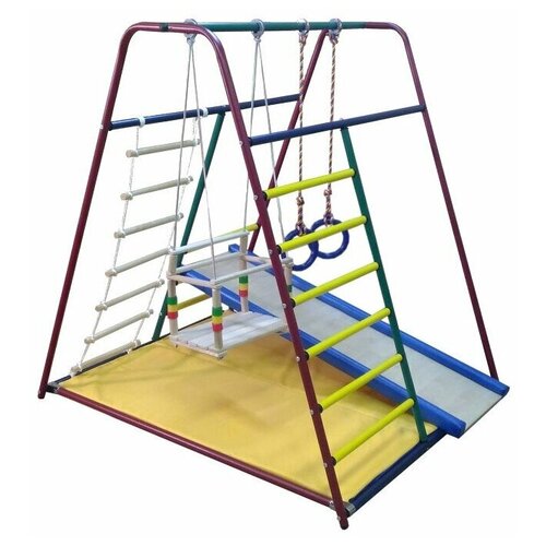 Комплектация: • Металлический каркас. • Металлические перекладины лестниц. • Гимнастический мат складной 125 х 95 х 4 см. • Горка с мягкими бортиками. Материал горки - ламинированное ДСП. • Качели верёвочные детские. • Лестница верёвочная (6 ступеней). • Кольца гимнастические.