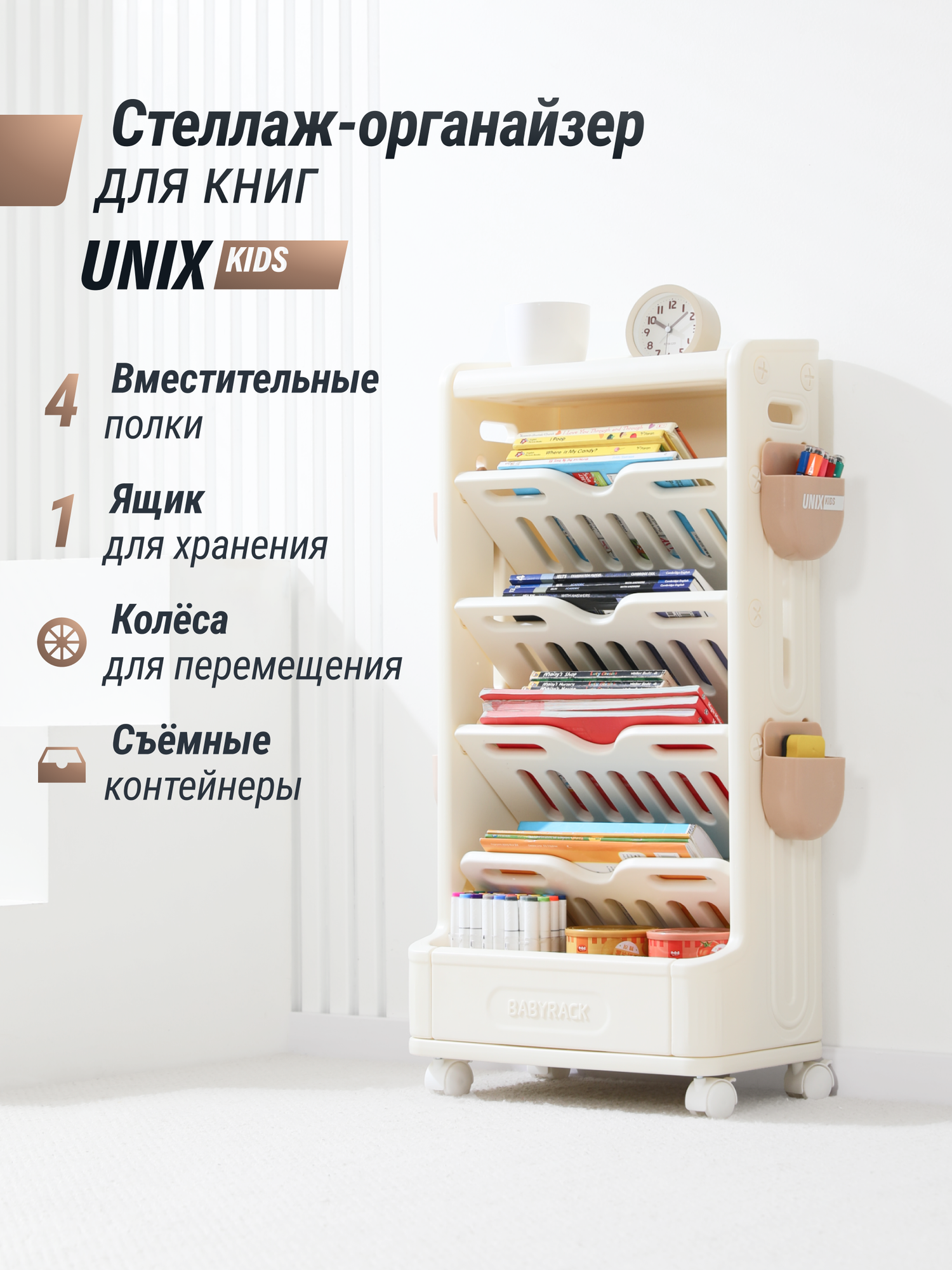 Купить Детский стеллаж для книг UNIX Kids Babyrack 4 полки, органайзер Монтессори для учебников и тетрадей, тумба для игрушек с доставкой по всей России.
