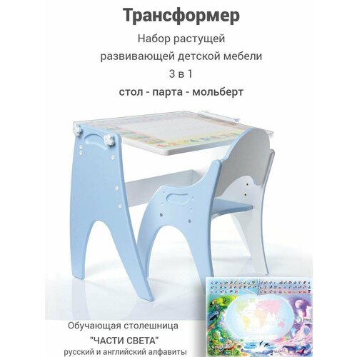 Детский стол и стул от бренда Тех Кидс (Tech Kids) - это не просто растущий набор детской мебели для мальчика и девочки, но и детская парта, превращающаяся в детский мольберт для рисования мелом. Детский стол трансформер и в комплекте к нему растущий стул для ребенка, станут просто незаменимыми для детских игр, обучения, рисования и творчества. Комплект детской мебели регулируемый по высоте, растущий вместе с ребенком объединяет в себе несколько предметов, а именно, столик детский, парту для письма и чтения, мольберт для рисования мелом, что существенно экономит бюджет и место в доме. Стол растущий детский с грифельной столешницей, можно использовать в трех положениях - детский стол, парта растущая для детей и мольберт меловой. Столешница с одной стороны покрыта ламинированной обучающей поверхностью с аппликацией "части света", а с другой стороны имеет меловую поверхность. На поверхности стола можно рисовать водными маркерами, а на поверхности мольберта - мелом и играть " в школу" или "садик". Подходит для детей ростом от 98 -130 см. Развивающая столешница "части света" содержит русский и английский алфавиты. Такой столик детский со стулом в наборе используют как игровой, письменный, стол для развивающих занятий и творчества. Столик детский растущий со стульчиком отлично подойдет для рисования, конструирования, лепки, чтения. Стол детский рекомендован для детей от полутора лет. Мебель для детской комнаты изготовлена из качественного МДФ премиум-класса, защищенного декоративной плотной пленкой ПВХ. Данный материал отличается прочностью и долговечностью, устойчив к влаге. Форма мебели анатомически правильная, а все углы закруглены и столешница защищена мягким кантом. Подробную информацию по размерам можно увидеть в фотогалерее товара и карточке товара. Благодаря современному дизайну и своей компактности парта детская со стулом впишется в интерьер любой, даже самой маленькой комнаты. Детская мебель в детскую комнату не требует специального ухода. Сборка занимает не более 5 минут, все необходимое для этого уже есть в комплекте. Набор мебели для детей - это нужный и оригинальный подарок на Новый год, день рождения, мальчику или девочке. Стол и стул подойдет как для совсем малыша, так и для ребенка дошкольника. Детский стол и стул отлично впишутся в любой интерьер и помогут детям в обучении и развлечении. Возможно, Вы искали набор мебели для детей, набор детской мебели, комплект детской мебели, комплект мебели для детей, мебель в детскую, детский стол и стул комплект мебели, детский стол и стул набор мебели детский стол и стул, детский стул, детский стол, детский столик и стульчик, детский стул и стол для рисования. Переходите в магазин продавца и смотрите еще больше моделей столов и стульев детских. Тех Кидс (Tech Kids) - мы делаем мебель из экологичных материалов с любовью к малышам.