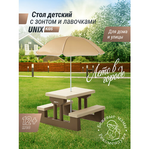 Детский комплект мебели UNIX Kids Garden пластиковый включает удобный стол, две лавочки и солнцезащитный зонт. Он разработан специально для комфортного пребывания и игр детей возрастом от 12 месяцев и старше, обеспечивая оптимальные условия для активных занятий и досуга как в помещении, так и на улице, даче, загородном участке.