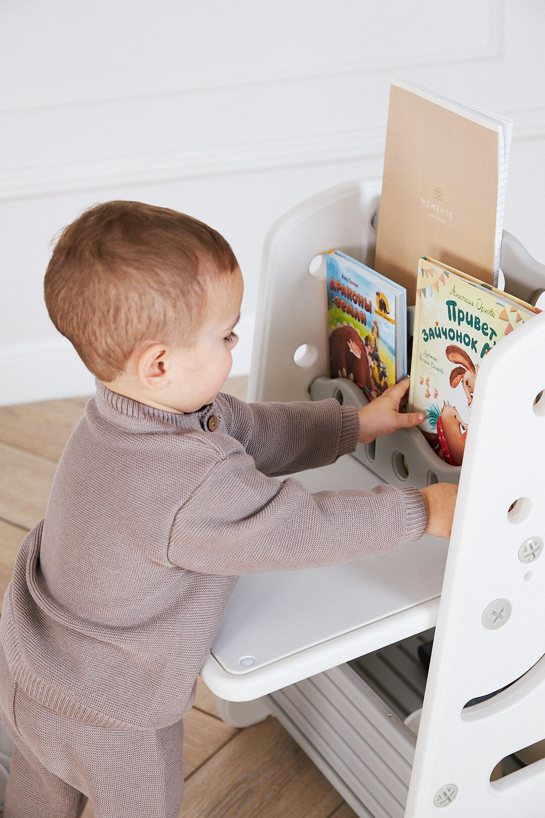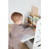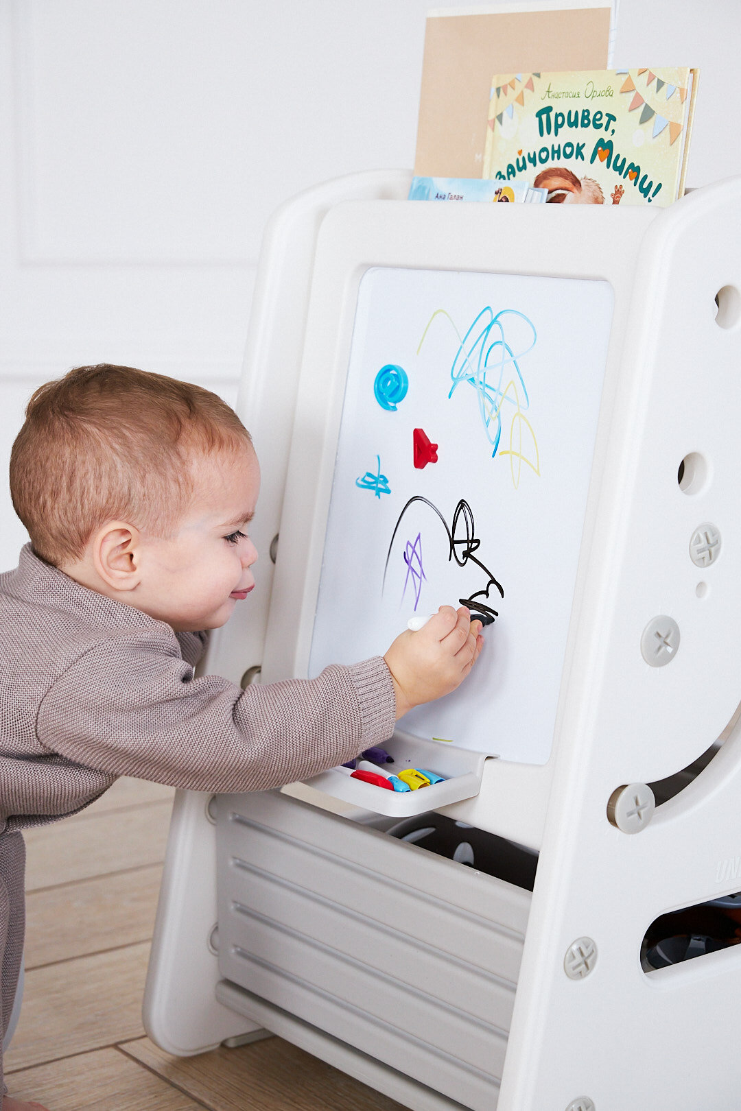 Кроме того, конструкция оснащена практичным стеллажом высотой 70 см, предназначенным для книг и альбомов. Малыш сможет самостоятельно брать необходимые материалы и возвращать их на место, развивая привычку к аккуратности и самостоятельности. Еще одно полезное дополнение — вместительный нижний ящик, предназначенный для мелких игрушек, что позволит поддерживать порядок в детской комнате.
