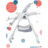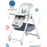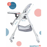 Стульчик-шезлонг для кормления и непродолжительного сна Babyhit Topping · Съемный и регулируемый в 3-х положениях столик · Съемный поднос · Регулировка наклона спинки в 3-х положениях · Регулируемая в 2-х положениях подножка · Регулировка высоты сиденья в 7 положениях · Четыре колеса с фиксацией (тормозом) · Чехол сиденья – экокожа · Мягкий вкладыш на сиденье · Подставка для планшета/телефона/книжки · 5-ти точечные удерживающие ремни · Корзина для игрушек