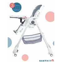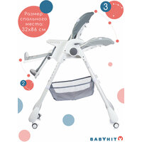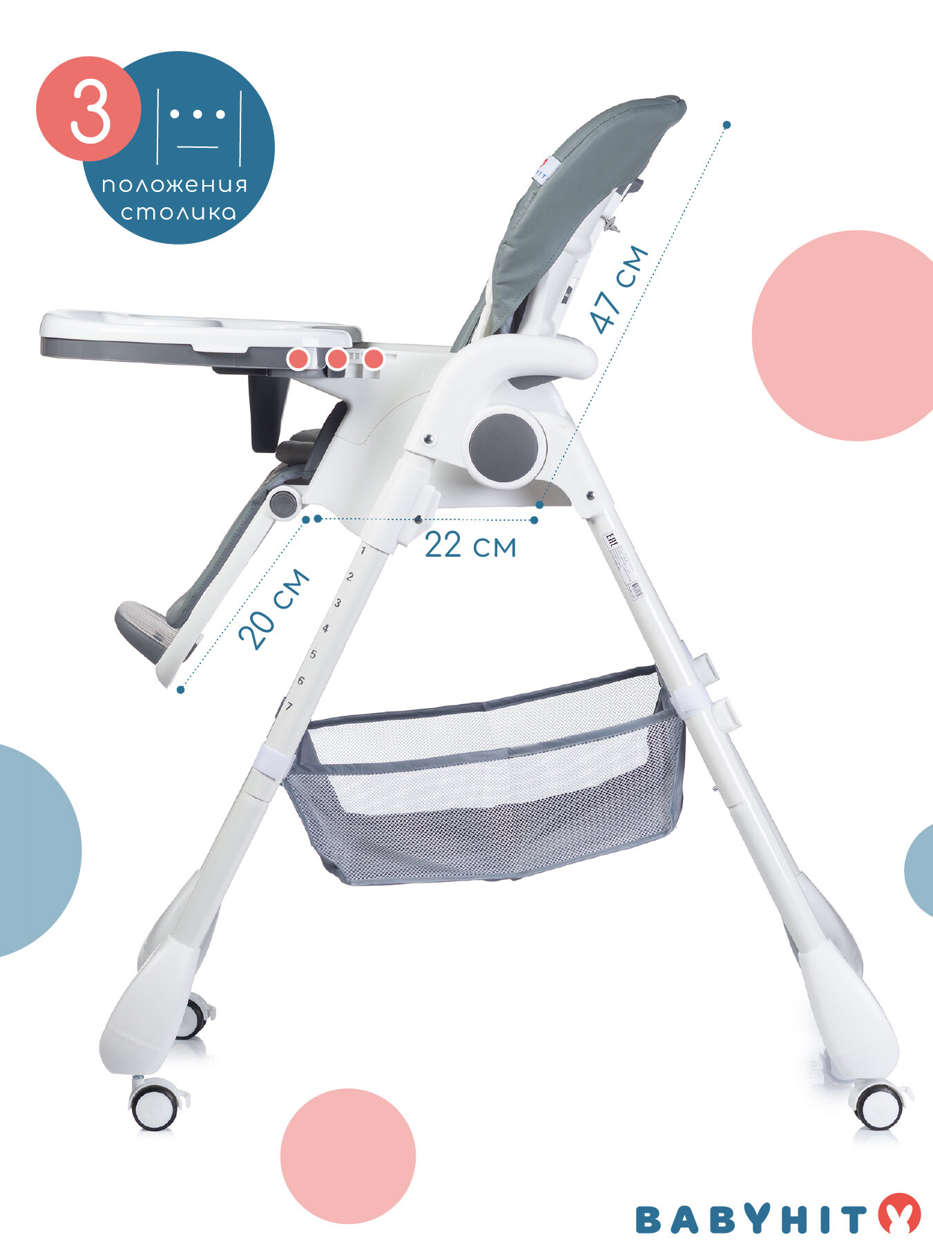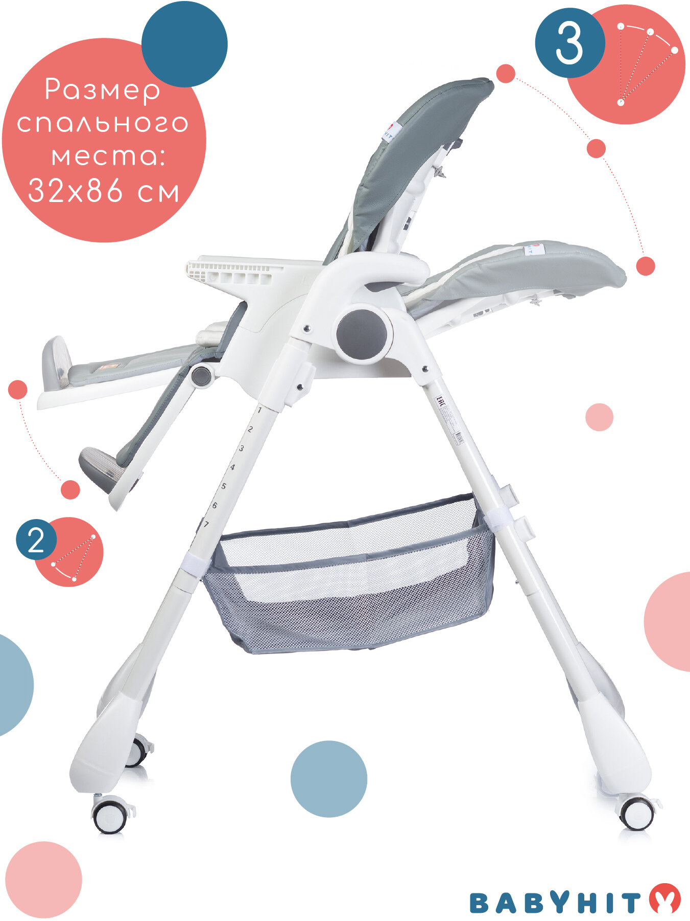 Стульчик-шезлонг для кормления и непродолжительного сна Babyhit Topping · Съемный и регулируемый в 3-х положениях столик · Съемный поднос · Регулировка наклона спинки в 3-х положениях · Регулируемая в 2-х положениях подножка · Регулировка высоты сиденья в 7 положениях · Четыре колеса с фиксацией (тормозом) · Чехол сиденья – экокожа · Мягкий вкладыш на сиденье · Подставка для планшета/телефона/книжки · 5-ти точечные удерживающие ремни · Корзина для игрушек