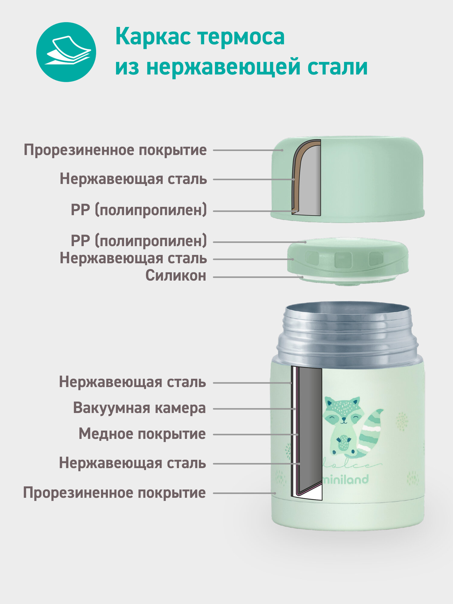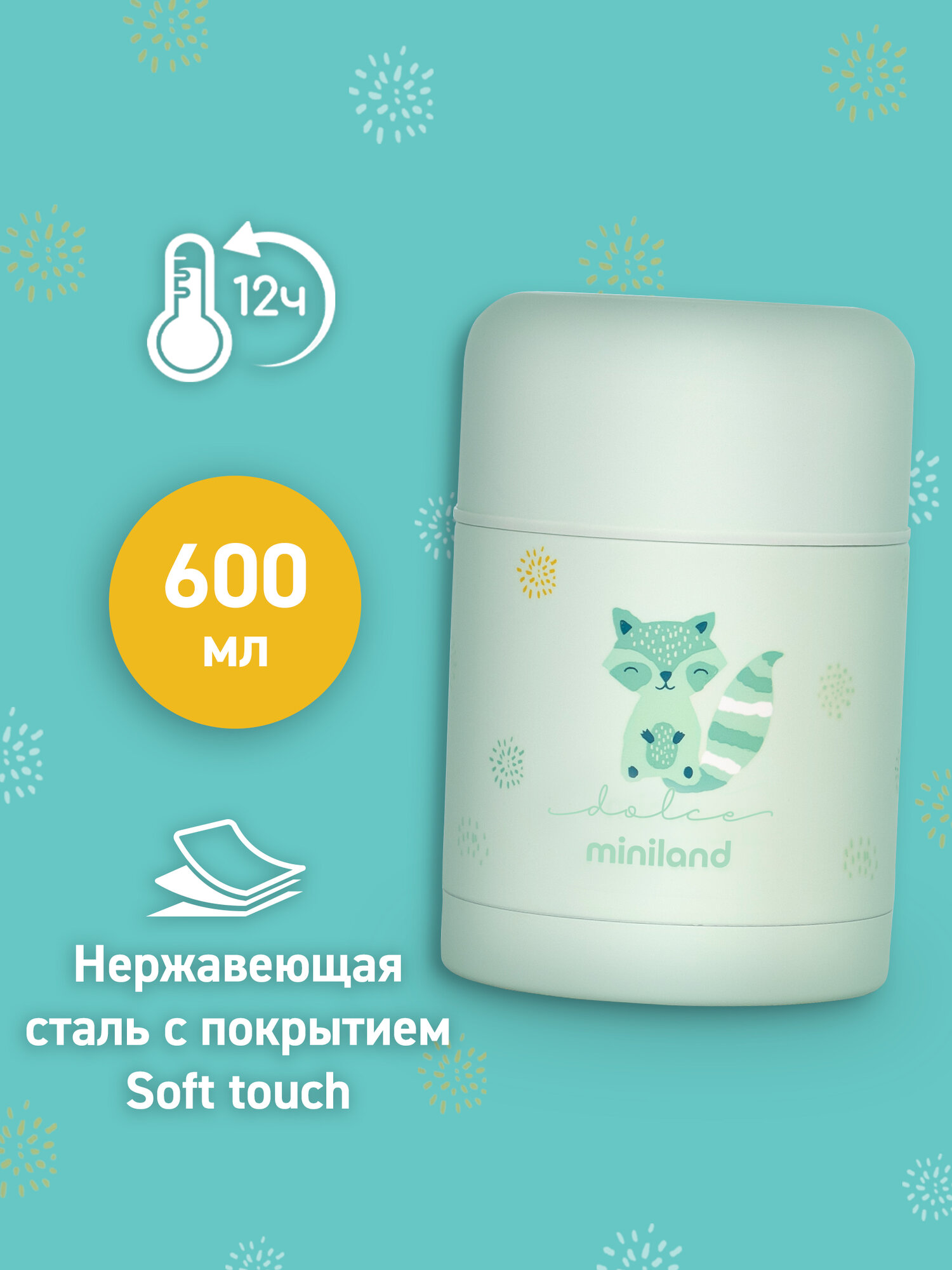 Термос детский для еды Miniland Thermy Dolce, с широким горлом, бирюзовый с енотом, 600 мл: сравнение цен, характеристики, фото, актуальное наличие и цены.