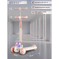 Особенности: - быстрая система складывания, - комфортные прорезиненные ручки, - светящиеся ушки и платформа, - колеса светятся во время движения, - мелодия, - ножной тормоз.
