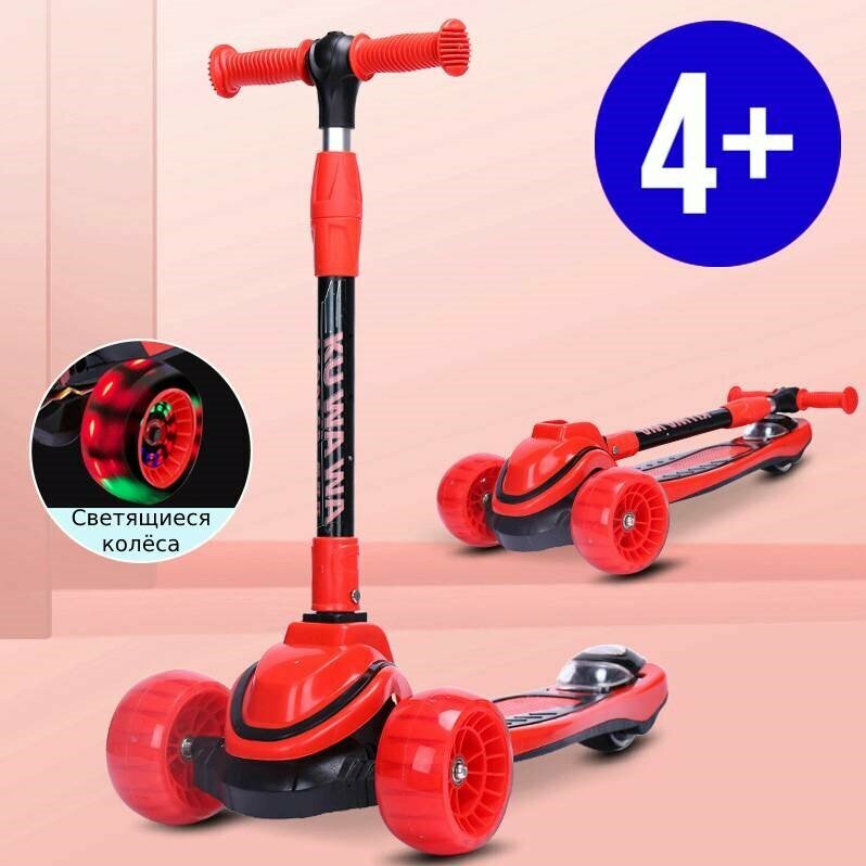 Купить Большой трёхколёсный самокат со светящимися колёсами, складной, для детей от 4-х лет Scooter Maxi Lights 606 Красный с доставкой по всей России.