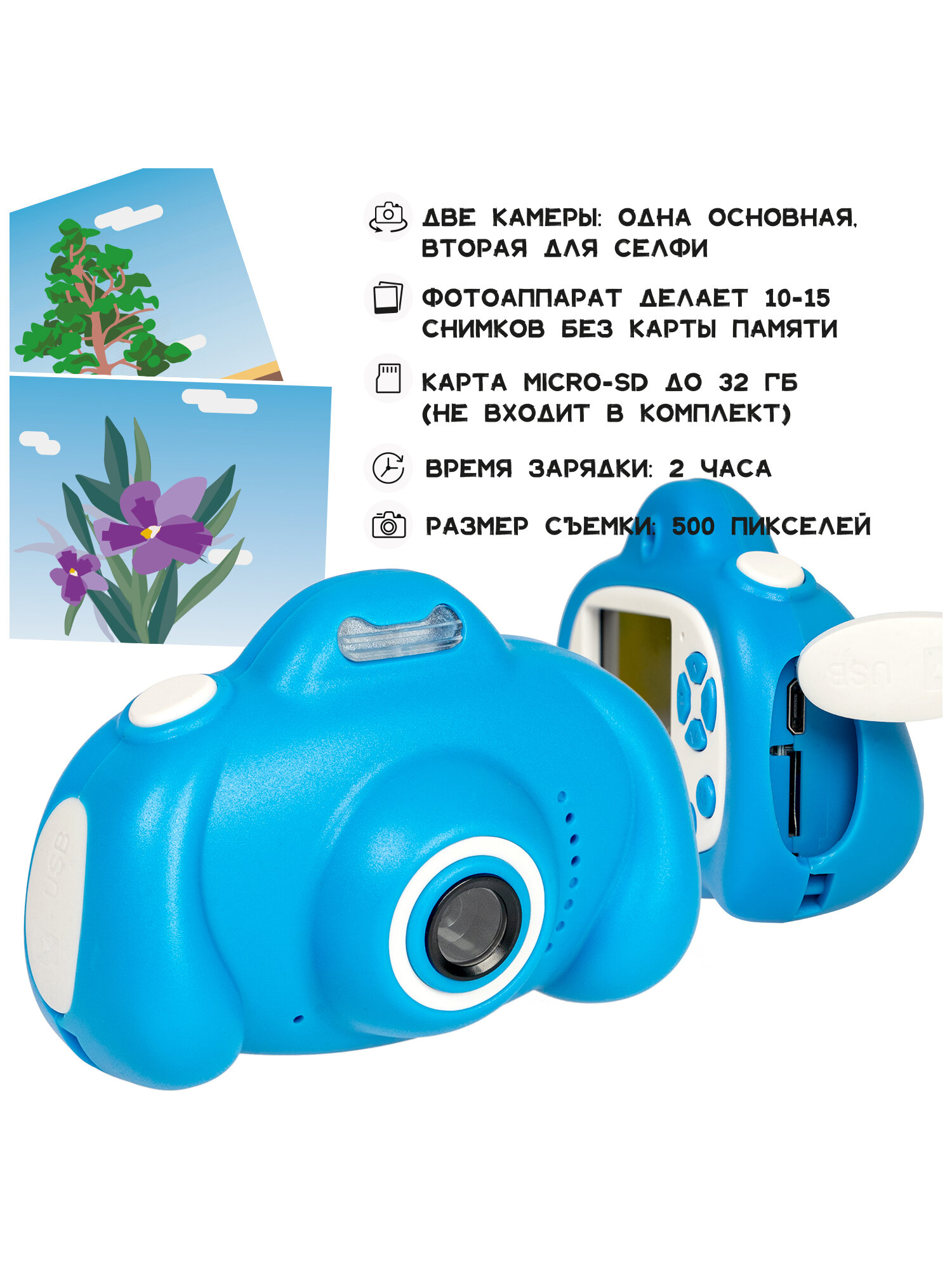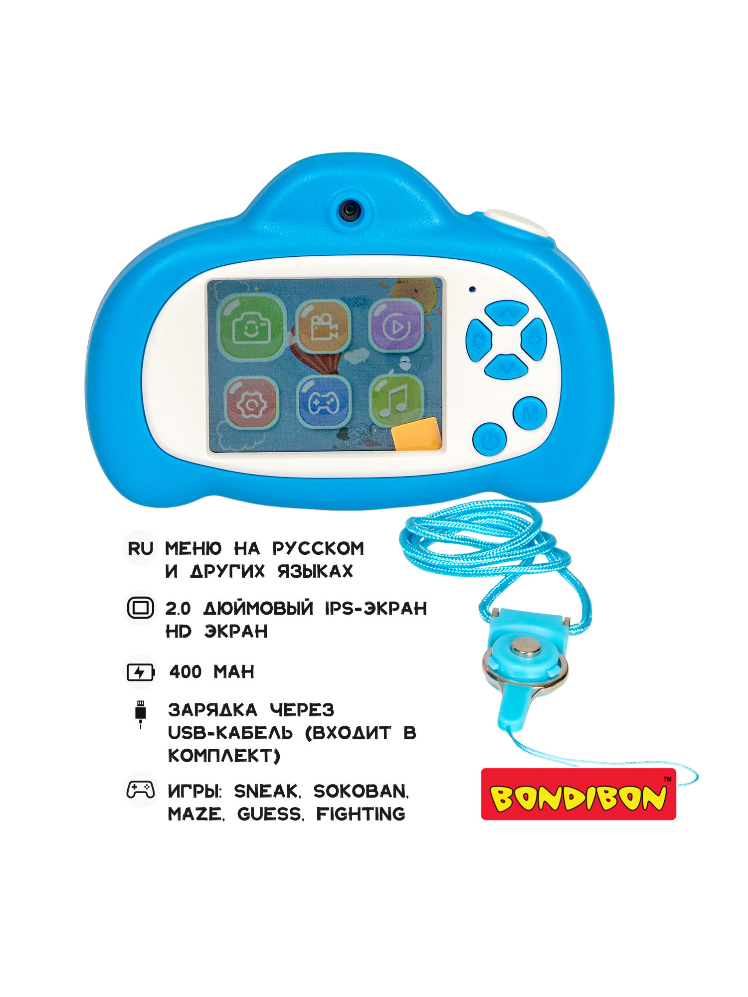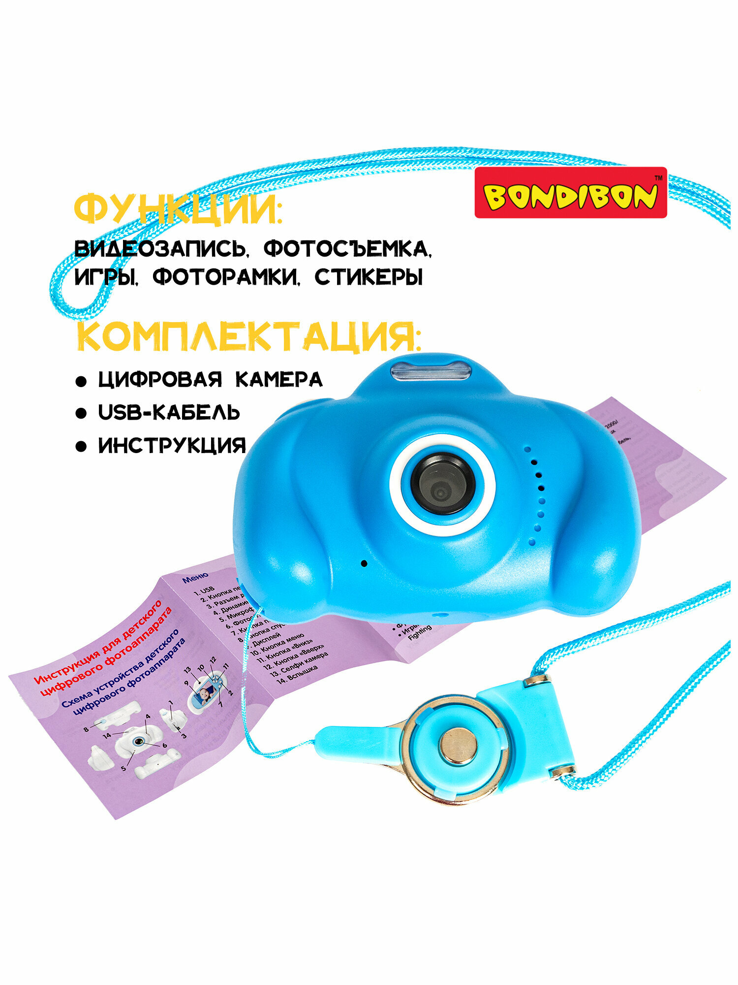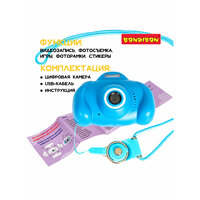 Купить Детский цифровой фотоаппарат с селфи камерой, голубой, видео, фотосьемка, пять игр, музыка, фоторамки, стикеры Bondibon с доставкой по всей России.