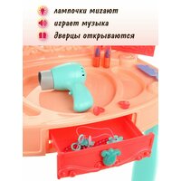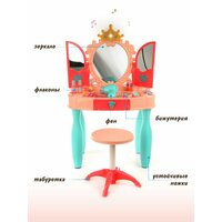 Набор парикмахера с зеркалом и стулом понравится каждой малышке. Игрушка туалетный столик со световыми и звуковыми эффектами. Множество предметов, реалистичный дизайн, игрушка фен на батарейках. Игрушечный набор парикмахера станет прекрасным подарком. Игрушка в красивой подарочной коробке, игрушка туалетный столик на батарейках. Прочные и долговечные материалы, прослужит много лет. В комплекте детали для сборки табурета, фен, игрушка расческа, 2 браслетика, 2 резиночки, фигурки-имитации лака, 2 помады, 3 колечка, детали для сборки столика. У губной помады снимаются колпачки. У флакончиков-имитаций лака снимаются крышечки. Браслетики на резинке, растягиваются. Функционал фена: - при нажатии на кнопку издает звук работы настоящего фена; - небольшая циркуляция воздуха. Функционал туалетного столика: - открываются дверки; - при нажатии на кнопку кнопка подсвечивается, издает звук волшебной палочки; - отсек выдвигается. Туалетный столик работает от 3 батареек АА, не входят в комплект. Фен работает от 1 батарейки АА, не входит в комплект. Материал: полимер. 23 предмета. Размеры собранного столика: 44*30*72 см. Размеры табуретки: 28*25 см. Размеры фена: 10*5*13 см. Размеры расчески: 12*4 см. Размеры губной помады: 1*6 см. Внутренний диаметр кольца: 2 см. Размеры коробки: 70*8*56 см.