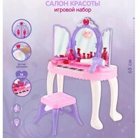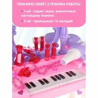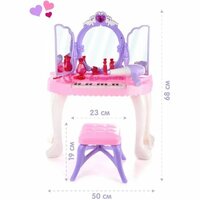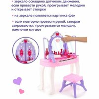 Детский подарочный набор стилиста пригодится каждой девочке для домашних игр в салон красоты. В комплект игрового набора для девочек входит пианино с зеркалом, стул, фен, расчёска, 2 заколки, 2 помады, 2 кольца, 2 браслета, ожерелье, духи. Зеркало оснащено датчиком движения, при проводе рукой проигрывает мелодию и открывает створки, на зеркале загорается картинка феи, лампочки мигают. При повторном проводе рукой створки закрываются, проигрывается мелодия, лампочки мигают. Пианино имеет два режима работы. В первом режиме издаёт звуки аналогичные настоящему пианино, во втором режиме проигрывает 13 мелодий. Фен включается и выключается, при включении начинает выдувать воздух. Помада открывается и закрывается. Духи открываются и закрываются. Заколка фиксируется на волосах. Кольцо надевается на палец. Браслет надевается на руку. Ожерелье надевается на шею. Игрушечный туалетный столик с феном, как и детское трюмо с зеркалом в чемодане, развивает воображение, слуховое и зрительное восприятие. Такой косметический набор принцессы для сюжетных и ролевых игр станет замечательным подарком девочке на 8 марта, день рождения, новый год или любой другой повод. Зеркало работает от батареек АА 3 шт, не входят в комплект, пианино работает от батареек АА 3 шт, не входят в комплект, фен работает от батарейки АА, не входит в комплект. Размеры упаковки 71х9х55 см. Размеры пианино вместе с зеркалом 50х23х68 см. Размеры браслета 5х5х1 см. Размеры стула 23х23х19 см. Размеры фена 16х6х13 см. Размеры ожерелья 13х11х1 см. Изготовлено из пластика.