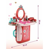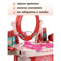 Детский подарочный набор стилиста в чемодане пригодится каждой девочке для домашних игр в салон красоты. В комплект игрового набора для девочек входят рабочая панель, две подставки, крепящиеся по бокам рабочей панели, зеркало, устанавливающееся на рабочую панель, 3 флакончика имитации лака для ногтей, 2 тюбика имитации губной помады, фен, флакончик имитация духов, расческа, 2 браслетика, ожерелье, 3 кольца, набор стикеров и чемоданчик, в который помещаются все предметы. Чемоданчик можно собрать двумя способами, в виде стойки и в виде туалетного столика, чемоданчик закрывается на защелку, есть ручка, удобно переносить. Зеркало крутится, у губной помады и лаков снимаются колпачки, ожерелье и браслеты не растягиваются. Игрушечный столик парикмахера с феном, как и детское трюмо с зеркалом, развивает воображение, слуховое и зрительное восприятие. Такой косметический набор принцессы для сюжетных и ролевых игр станет замечательным подарком девочке на 8 марта, день рождения, новый год или любой другой повод. Игрушка для девочек изготовлена из высококачественного и безопасного полимерного материала, упакована в чемоданчик. Размеры чемоданчика, собранного в виде макияжного столика 42х29х29,5 см. Размеры чемоданчика, собранного в виде стойки 42х20х50 см. Размеры фена 10х5х11 см. Размеры расчески 5,5х1,5х10,5 см. Размеры губной помады 1,5х1,5х5,5 см. Внутренний диаметр кольца 1,5 см. Размеры чемоданчика упаковки 27х10,5х22 см.
