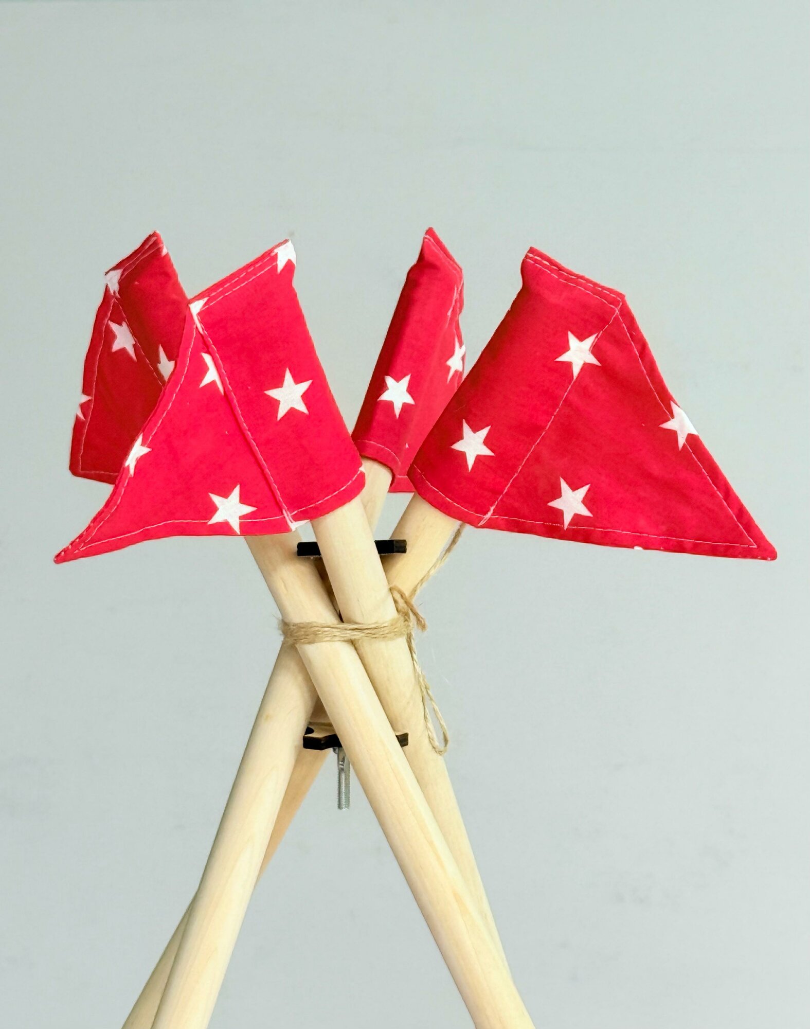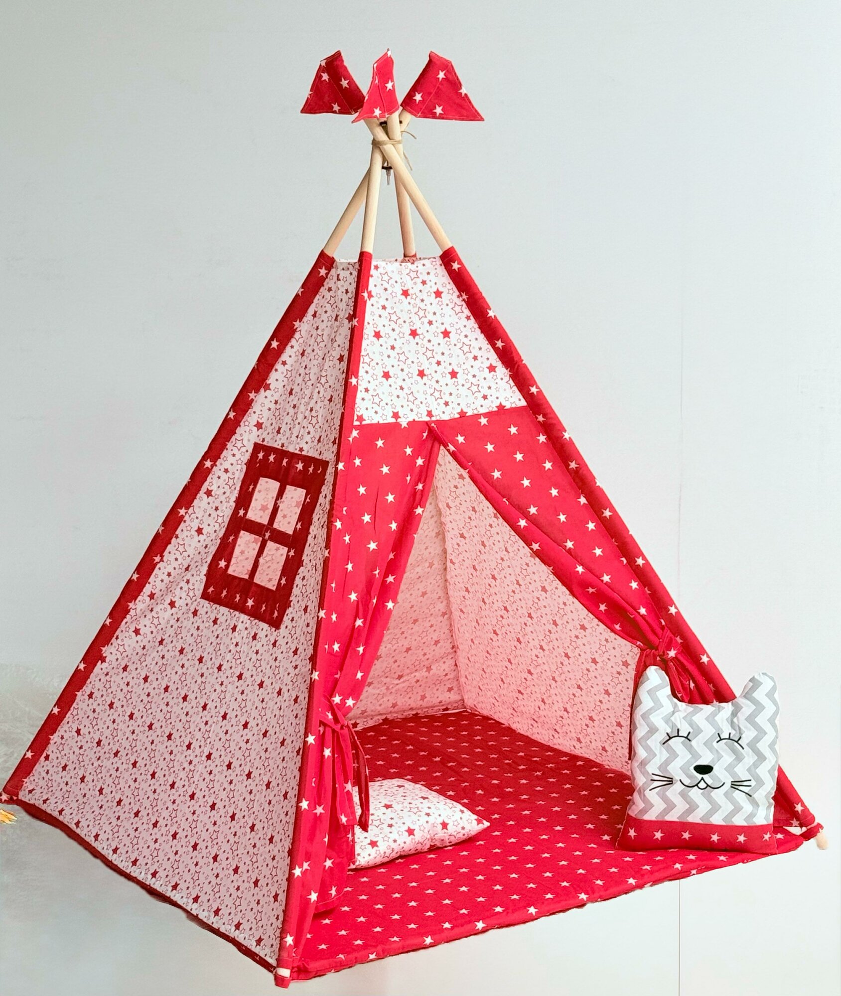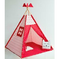 Детский вигвам – это уютное, укромное местечко в комнате, о котором мечтает каждый ребенок. Подходит для игр как в комнате так и на природе. Развивающий игровой вигвам отличный подарок любым деткам. Подходит от 3 до 12 лет. Материал 100 % хлопок. Каркас сделан из натурального дерева - берёза. Высота вигвама в собранном виде 160 см. В комплектацию входит: деревянные стойки 4 шт (палки состоят из 2-х частей по 90 см), вигвам с окошком, коврик 120*120, подушка, подушка-месяц, флажки - 4 шт. и система антискладывания. Вся продукция прошла обязательную сертификацию.