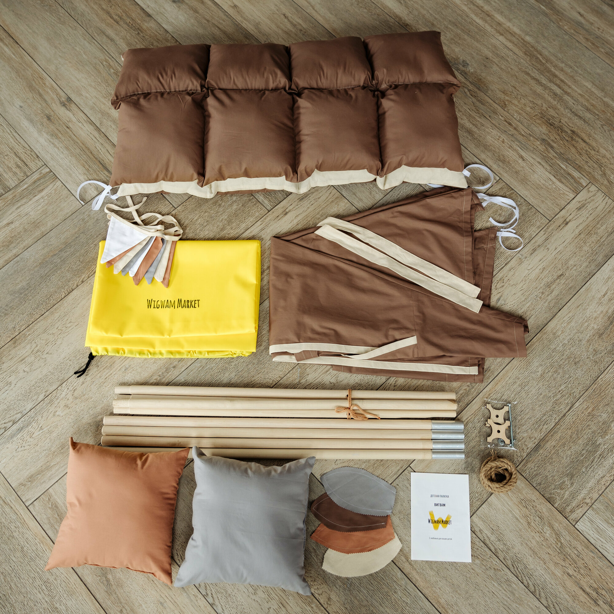 1) Вигвам на палках. Размер 150 см/115 см/115 см. 2) Окошко со шторкой, кармашек для игрушек 3) Пышный коврик, на углах коврика завязки, чтобы крепиться к палкам вигвама. 115 см/115 см. 4) 2 квадратные подушки в цвет вигвама 35 см/35 см 5) Гирлянда -флажки на ленте 6) Флажки-листочки 7) Красивый чехол для хранения( заменит подарочную упаковку)