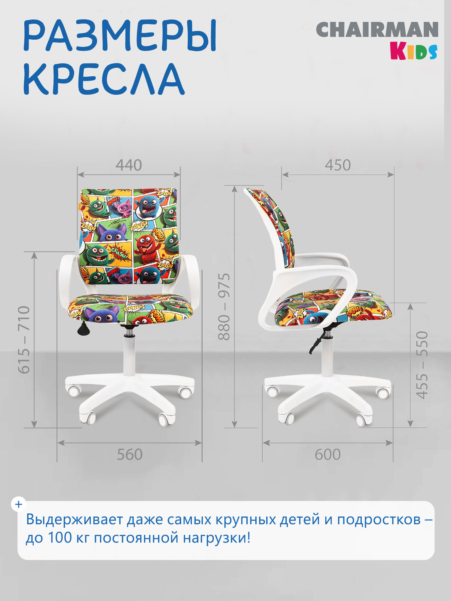 CHAIRMAN KIDS 103 LT – самое взрослое кресло для детских комнат из этой линейки. Стильное, широкое, удобное и надежное. Оно выдерживает до 100 кг постоянной нагрузки, что позволяет использовать его как и кресло для подростка, так и для взрослого, на общем рабочем месте.
