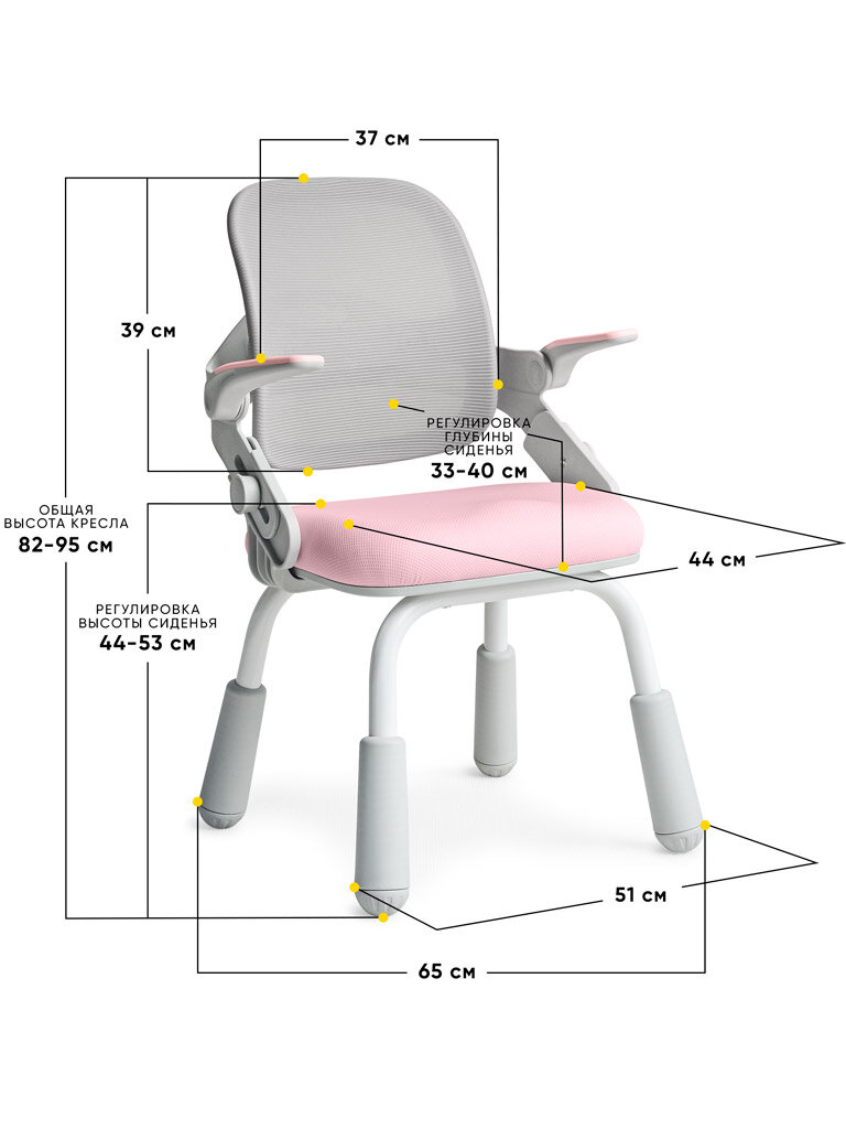 Высота - 44 - 53 см. Ширина - 44 см. Глубина - 33 - 40 см. Материал каркаса – металл. Возраст ребенка - от 5-и лет . Универсальные (подходят для стандартных столов и для столов с регулировкой высоты). Максимальная нагрузка - до 100 кг. Материал обивки – текстиль. Регулировка высоты сиденья. Синхронная регулировка глубины сиденья и высоты спинки.