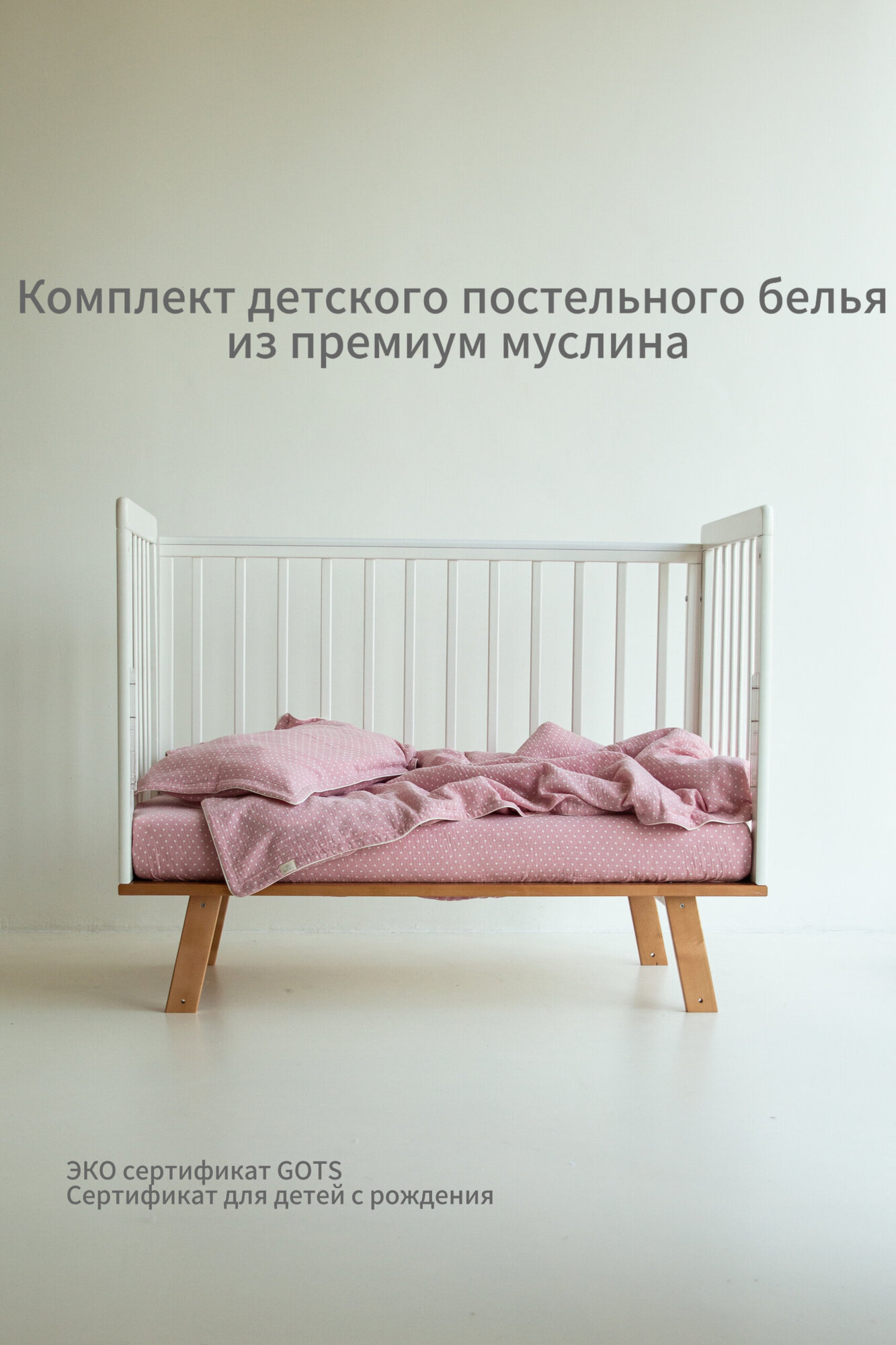 Детское постельное белье, комплект 120х60, муслин, 3 предмета, простыня на резинке, цвет горох на пудровом: сравнение цен, характеристики, фото, актуальное наличие и цены.