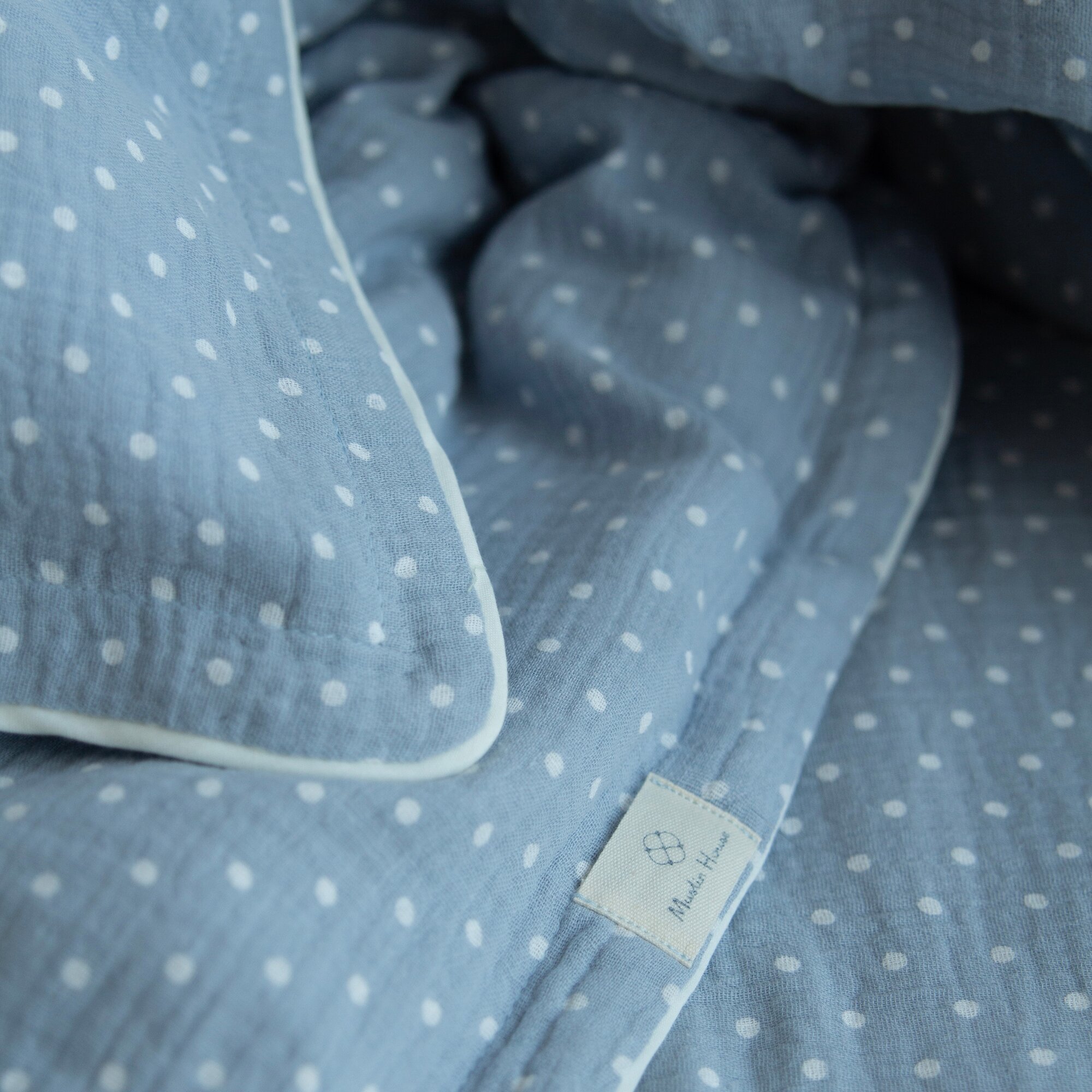 Купить Детское постельное белье, комплект 140х70, муслин, 3 предмета, простыня на резинке, цвет горох на серо-голубом с доставкой по всей России.