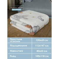 Плед 100х118 см + постельное белье в кроватку для новорожденного ребенка. КПБ для грудничков выполнен из 100% хлопка. Он состоит из наволочки 40х60, пододеяльника 112х147 см, простыни 120х60 см на резинке по периметру. Подойдет на классическую кровать, для овальной и круглой не подходит. Ткань поплин является абсолютно экологичной и гипоаллергенной. Отличается высоким качеством и нежным, приятным дизайном. Ткань поплин плотная, устойчива к износу, не линяет и не деформируется при стирке, быстро сохнет и легко гладится. Плед из микровелюра. Набор станет отличным подарком молодой маме и малышу. Это лучшее решение покупки для дома и дачи, на выписку из роддома, Новый Год и Рождество.
