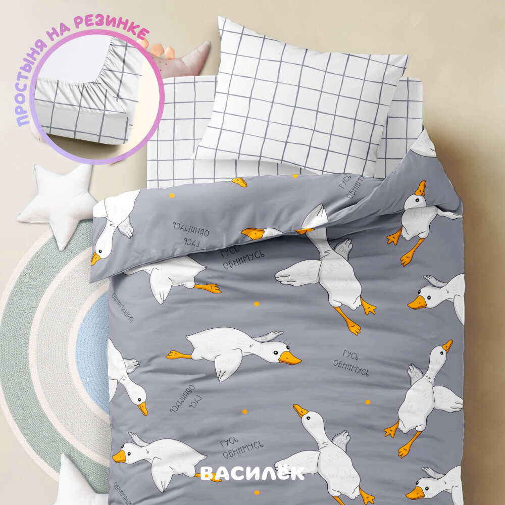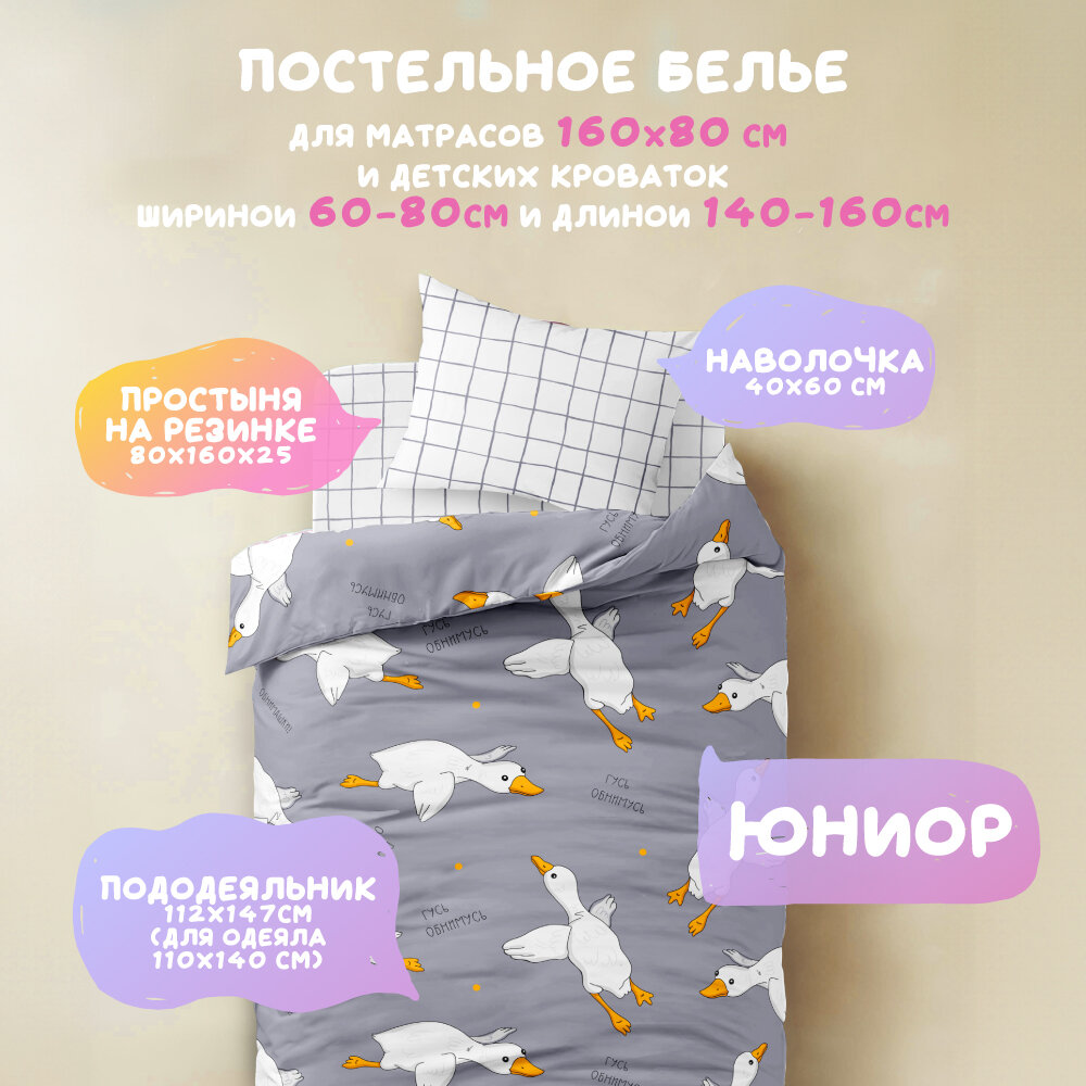 Постельное белье детское 160х80 для девочек и мальчиков из хлопковой ткани от ивановского бренда Василек. В набор Юниор входят: пододеяльник, простыня на резинке 80х160 см и наволочка. Натяжная простынь на резинке 80*160 см рассчитана на высоту матраса до 25 см, резинка вшита по всему периметру. Простынь на резинке надежно фиксирует простыню, не давая простыни сминаться. Простыня на резинке способствует качественному сну и комфорту ребенка. Материал – ткань поплин, в составе которой 100% хлопок. Ткань поплин нежная на ощупь, хорошо пропускает воздух, что позволяет малышу чувствовать себя комфортно во время сна, а красивые и яркие дизайны будут радовать его во время пробуждения. Уход за вещами простой – бережная стирка при температуре не более 40 градусов. Односпальный комплект в детскую кроватку с принтом Гусь обнимусь - лучший подарок ребёнку. Красивый комплект для малыша, включающий в себя пододеяльник 147х112 см, простынь на резинке 80х160х25 см и наволочку 40х60 см, подойдет для кроватки в виде машинки, для кровати домика, для двухъярусной кровати, двухэтажной кровати на матрас 80х160 см и 70х160, подходит для прямоугольных матрасов, подойдет в овальную детскую кровать. Односпальное детское постельное белье 160 х 80 для дочки и сына можно выбрать постельное белье в классическом сером оттенке с трендовым принтом Гусь обнимусь, выполненное в красивых цветах с гусями, которое с первого взгляда отдает нежностью, позитивом и веселым настроением, обеспечит вашему ребенку крепкий сон, создаст спокойную легкую атмосферу и станет прекрасным подарком на день рождения. Подберите нежные и сочные цвета для вашей девочки или мальчика. Мама непременно должна подарить такой высококачественный комплект для 1,5 спальной кроватки своему малышу. Холодная зима или жаркое лето, слякотная осень или солнечная весна – дарите радость себе и близким круглый год с постельным бельем от производителя ТДЛ текстиль из Иваново. Это нужная вещь в кроватку на весь год. Уважаемые покупатели! Пожалуйста, внимательно ознакомьтесь с правилами возврата приобретенного товара на площадке.