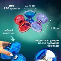 Диаболо диаметром 12,5 см, высота 14,5 см и весом 290 грамм идеально подходит для детей и начинающих жонглеров. Небольшой вес и минимальный диаметр чаш делают данную модель простой в использовании. Чаши диаболо выполнены из мягкого пластика, что позволяет смягчить удар при падении на асфальт и прочую жесткую поверхность. Оси и шайбы выполнены из стали, что гарантирует прочность и долговечность диаболо.