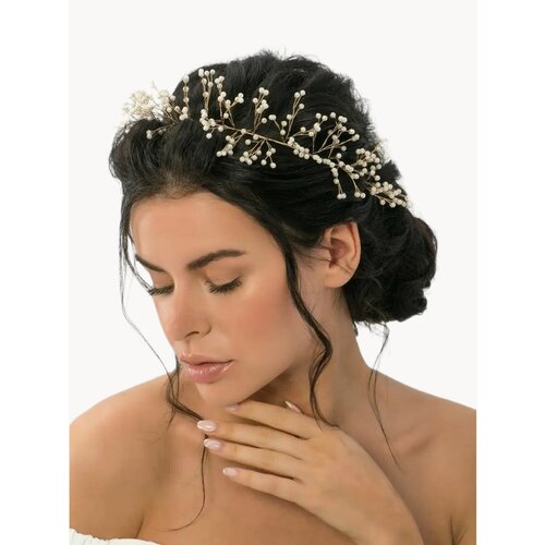 Диадема выполнена из бижутерного сплава золотистого цвета, что придает ей роскошный вид. Украшение украшено искусственным жемчугом, который добавляет изящества и блеска.