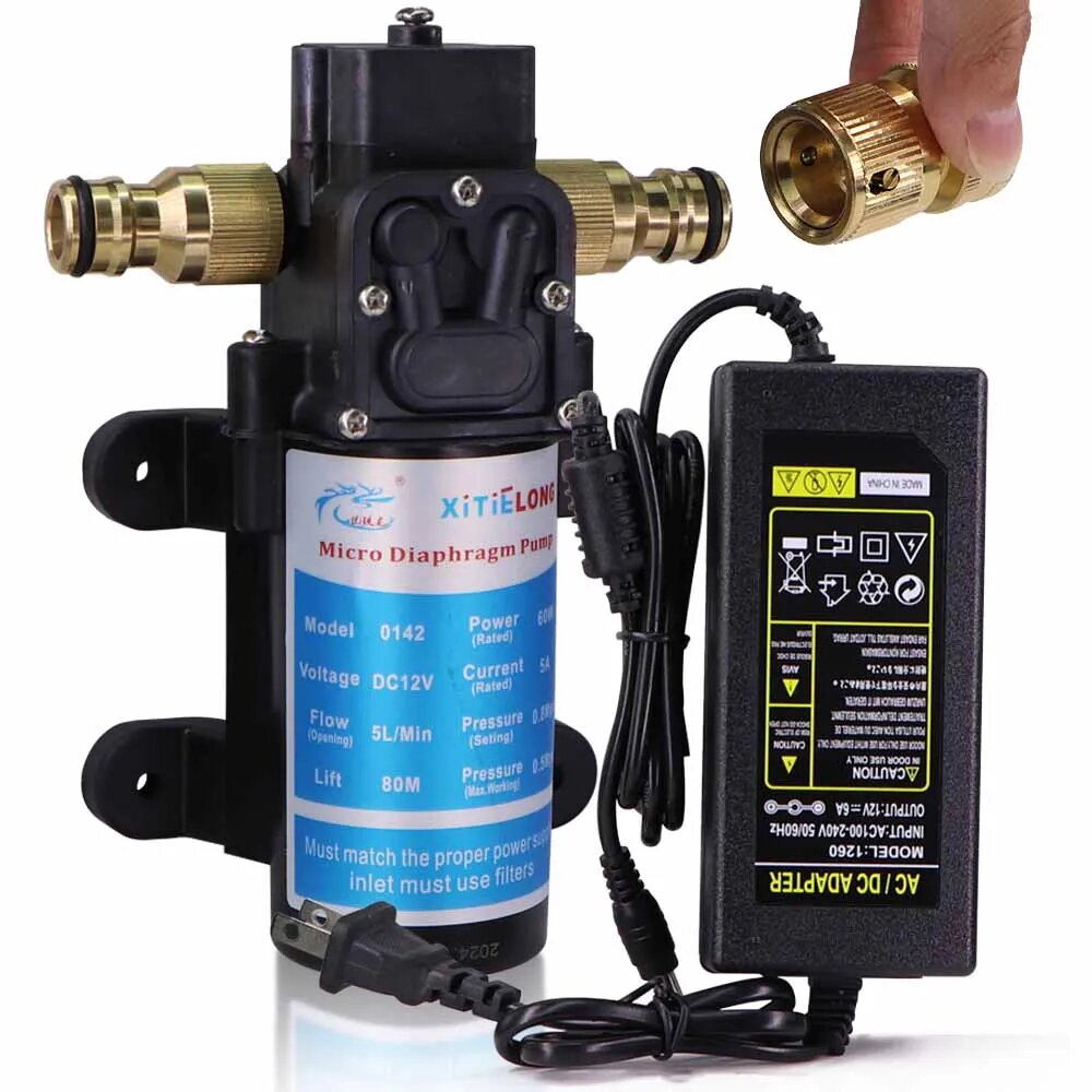 - [GOOD PERFORMANCE & LOW POWER CONSUMPTION]: This diaphragm pump delivers smooth & consistent flow at all ranges of operation, while drawing low current. Super power-saving (45/60/80/100 Watts, DC 12V, 3.75A / 5A / 6.67A / 8.33A) but good performance (4L/Min, 0.7Mpa; 5L/Min, 0.8Mpa; 6.67L/Min, 0.9Mpa; 8.33L/H, 1.1Mpa). 40% power saved than other similar products.- [WIDELY APPLICATION]: The 12V water pump is widely used for sprayers, garden sprinklers, lawn, shower, water taps in the boat, caravan, travel trailers, car washing, garden watering, house cleaning, even for pets living and so on.- [SELF PRIMING]: Self-priming function allows it to be mounted above water tank, able to run dry.