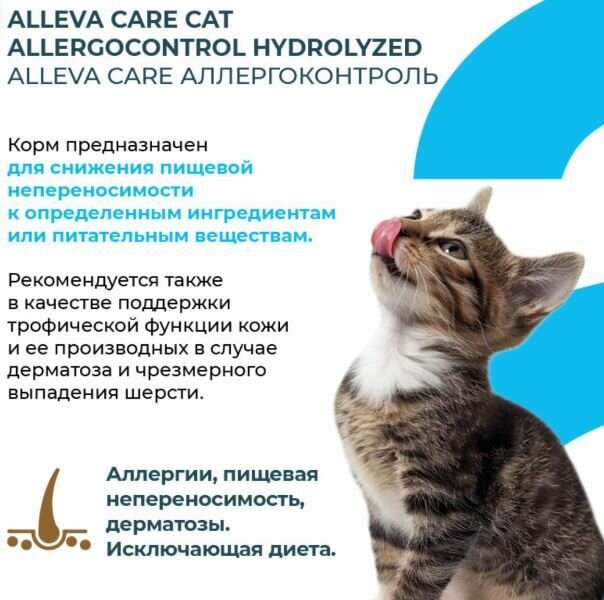 Для ограничения реакций иммунной системы в корме Alleva Care Allergocontrol в качестве единственного источника белка используется гидролизованная сельдь с низким молекулярным весом (70% ниже 2 000 дальтон, максимально 6 000 дальтон), а в качестве углеводов используется картофельный крахмал, прошедший тщательную очистку от белковой составляющей. Высокая концентрация незаменимых жирных кислот (линолевая кислота, эйкозапентаеновая кислота (EPA) и докозагексаеновая кислота (DHA)) из жира сельди и масла подсолнечника поддерживает здоровье кожи и уменьшает воспаление. Очищенный Алоэ вера способствует укреплению общей резистентности организма, стимулирует процессы регенерации кожи и эпителиальный трофизм.