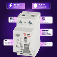 Купить Дифавтомат 2P (1П+N) 16А 4.5кА 30мА C AC SIMPLE D12E2C16AC30 АВДТ АД-12 Б0058920 ЭРА 2шт с доставкой по всей России.
