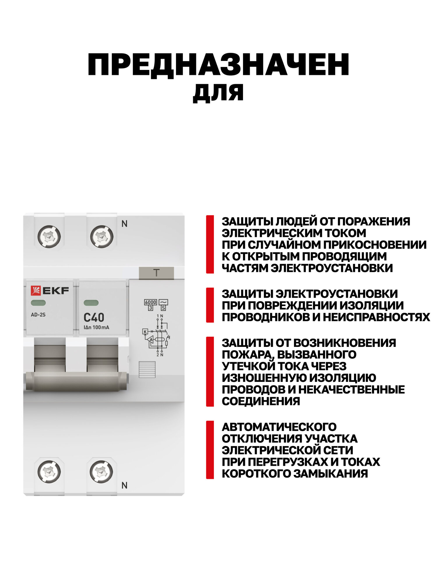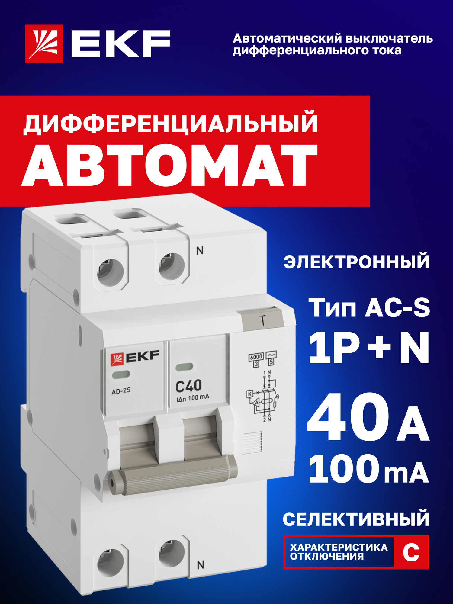 Дифавтомат 40А (C) S 100мА EKF PROxima АД-2 тип AC-S, 1P+N (двухполюсный), электронный, селективный, 6кА: сравнение цен, характеристики, фото, актуальное наличие и цены.