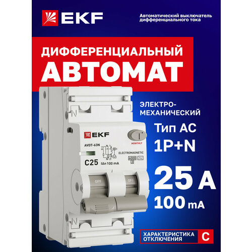 Купить Дифавтомат EKF PROXIMA АВДТ-63N 25А (C) 100мА, тип AC, 1P+N (двухполюсный), 6кА, электромеханический с доставкой по всей России. Дифавтомат EKF PROXIMA АВДТ-63N 25А (C) 100мА, тип AC, 1P+N (двухполюсный), 6кА, электромеханический: сравнение цен, характеристики, фото, актуальное наличие и цены.