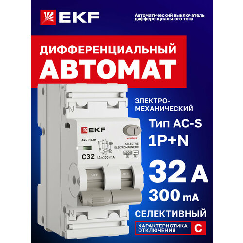 Автоматический выключатель дифференциального тока селективный АВДТ-63N (S) 1P+N 32А 300мА характеристика C тип AC электромеханический 6кА PROXIMA EKF – это надежное и эффективное устройство, предназначенное для использования в электрических цепях переменного тока. Он является неотъемлемым элементом электроустановок в жилых и общественных зданиях, гарантируя безопасность и стабильность работы всей системы. Данный дифавтомат обеспечивает защиту людей от поражения электрическим током при косвенном прикосновении к открытым проводящим частям электроустановки. Также он защищает саму электроустановку при повреждении изоляции проводников и неисправностях. Кроме того, устройство предотвращает возгорания и пожары, вызванные протеканием токов утечки и короткими замыканиями. При перегрузках и токах короткого замыкания дифавтомат автоматически отключает участок электрической сети. Технические характеристики автоматического выключателя дифференциального тока селективного АВДТ-63N (S) 1P+N 32А 300мА характеристика C тип AC электромеханический 6кА PROXIMA EKF включают номинальный ток в 32А и ток утечки в 300мА. Отключающая способность устройства достигает 6кА, что обеспечивает его высокую эффективность. Одним из уникальных преимуществ этого дифавтомата является его конструкция. Подключение возможно как сверху, так и снизу при помощи шин PIN и FORK. Нейтральный проводник подключается слева, а с левой стороны есть возможность подключения дополнительных аксессуаров. Устройство оборудовано индикаторным окном реального состояния контактов с защитой и теплоотводящим каналом на корпусе. Кроме того, дифавтомат имеет современный дизайн, двойную рукоятку – индикатор причины срабатывания и усиленный момент затяжки 3 Нм. Автоматические выключатели дифференциального тока АВДТ-63N PROXIMA EKF соответствуют ГОСТ IEC 61009-1, что подтверждает их высокое качество и безопасность. Гарантийный срок составляет 7 лет, а страна-изготовитель - Китай. Комплектация включает в себя один автоматический выключатель дифференциального тока селективный АВДТ-63N (S) 1P+N 32А 300мА характеристика C тип AC электромеханический 6кА PROXIMA EKF.