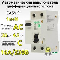 Дифавтомат Schneider Electric 1P+N C16А 30мА тип АС однофазный электронный 4,5кА Easy9 EZ9D34616
