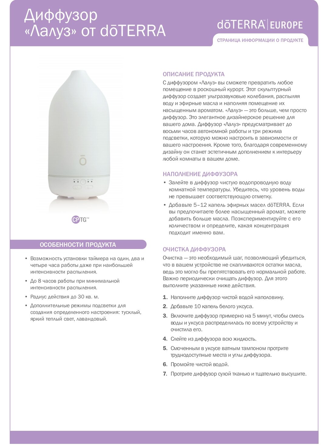 Диффузор doterra Laluz от doTERRA - это не просто устройство для увлажнения и очистки воздуха. Это также источник приятных ароматов, которые могут создать атмосферу уюта и комфорта в вашем доме.