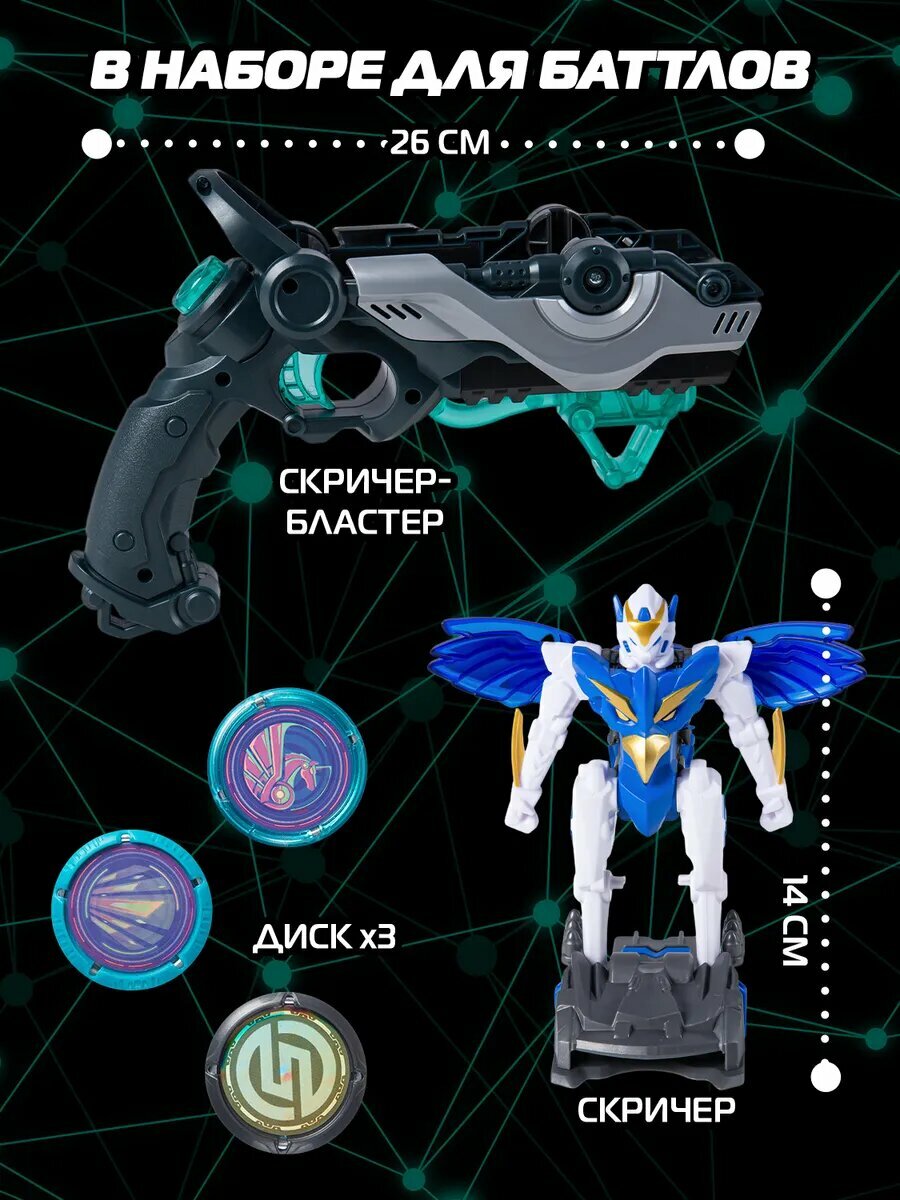 Новинки Диких Скричеров стирают границы между вселенными! Представляем тебе первый Скричер-Бластер – революционный девайс коллекции Кибер из метавселенной Сайберсити, который разрывает границы между мирами! Он не только запускает Скричеров, но и заряжается несколькими дисками для захватывающих атак. Встречай Робота Геллера – Скричера из Галактики Резца, нового компаньона главного героя Ксандера в метавселенной Сайберсити. Суперсилу Геллеру дает ветер. Этот робот-трансформер не просто игрушка – это твой билет в мир эпичных баттлов! Будь готов к любым вызовам с линейкой Кибер Бласт Чардж! Скричер-Бластер имеет 2 режима игры: стреляй дисками и запускай Скричера! Поймав диск, твой Скричер сделает кувырок на 360° и трансформируется! Стань настоящим Кибер-стражем и покажи всем, на что ты способен! Собери всю новую коллекцию Кибер и устраивай незабываемые Скричер-баттлы! Баттлить не сложно, сложно не баттлить! В набор входит машинка-трансформер Геллер (14х12х10 см), пусковая установка Скричер-Ган (26х15х8 см), 3 энергетических диска, инструкция, наклейки. Игрушка упакована в коробку с окном 25х30х11 см. Играй где угодно – никаких дополнительных приспособлений не нужно! Машинка-трансформер выполнена из высококачественного материала, товар сертифицирован. Эксклюзивный дистрибьютор бренда "Дикие Скричеры" на территории РФ - компания "РОСМЭН".