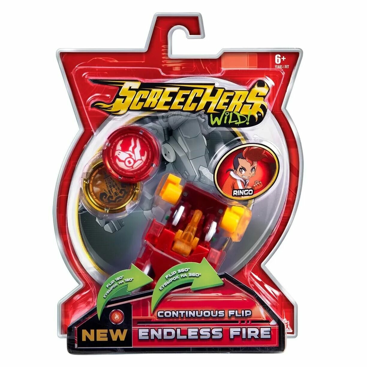 двойной кувырок; скричер разгоняется, ловит диск, делает кувырок на 180, захватывает второй диск, делает кувырок на 360 и самостоятельно трансформируется прямо в воздухе; обратно в машинку игрушка собирается вручную; скричеры 4-ой линейки взаимозаменяемы со скричерами из линейки «Турбо-Скричер»