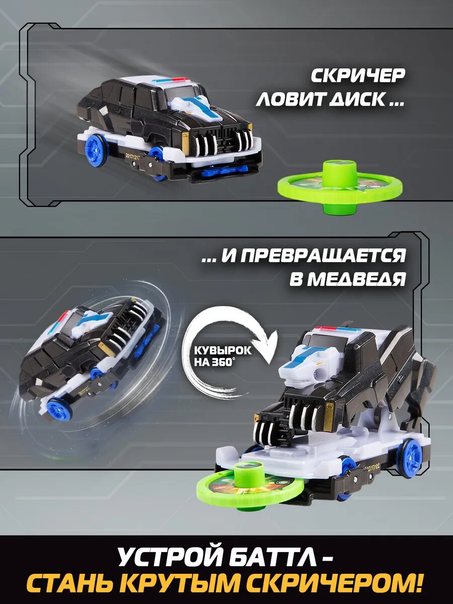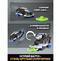 машинка разгоняется, ловит специальный диск, делает кувырок и самостоятельно трансформируется в животное прямо в воздухе. Обратно в машинку игрушка собирается вручную