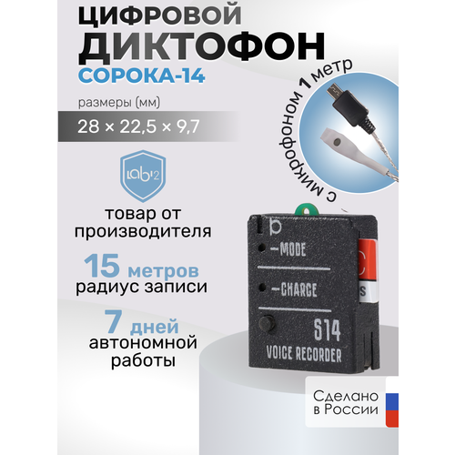 Диктофон "Сорока-14" - это высококачественный цифровой диктофон, который обеспечивает продолжительность работы до 183 часов. Он оснащен функцией активизации по голосу, что позволяет начать запись при обнаружении звука.
