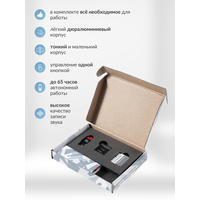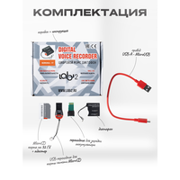В комплект поставки входят: диктофон, карта памяти microSDHC 10Class 32GB, переходник для зарядки аккумулятора, паспорт, USB кабель для зарядки диктофона, Card Reader.
