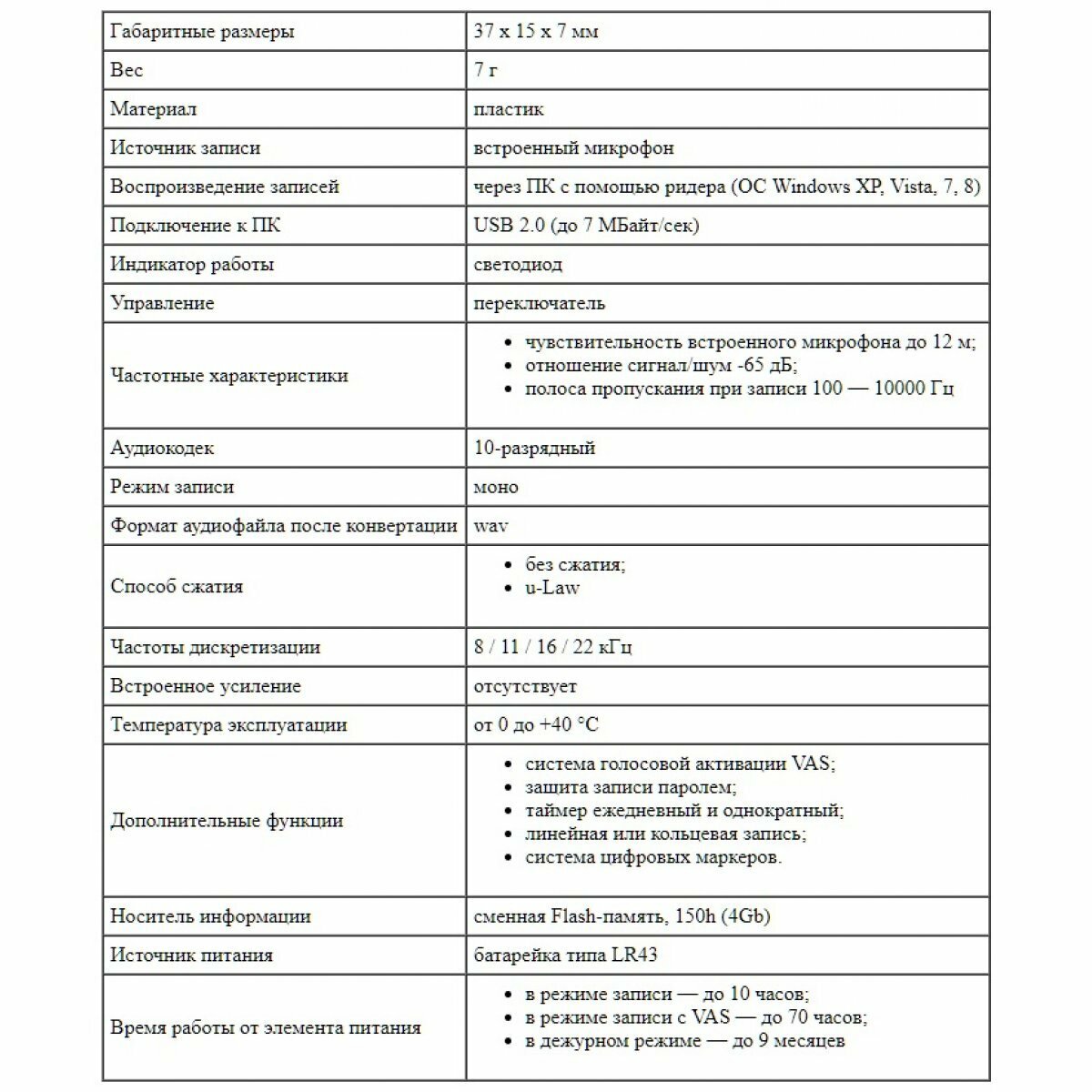 | Минимальная частота записи | 4000 Гц |