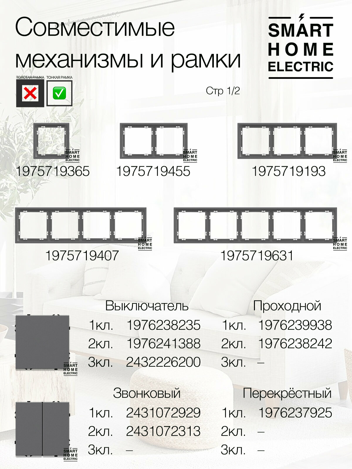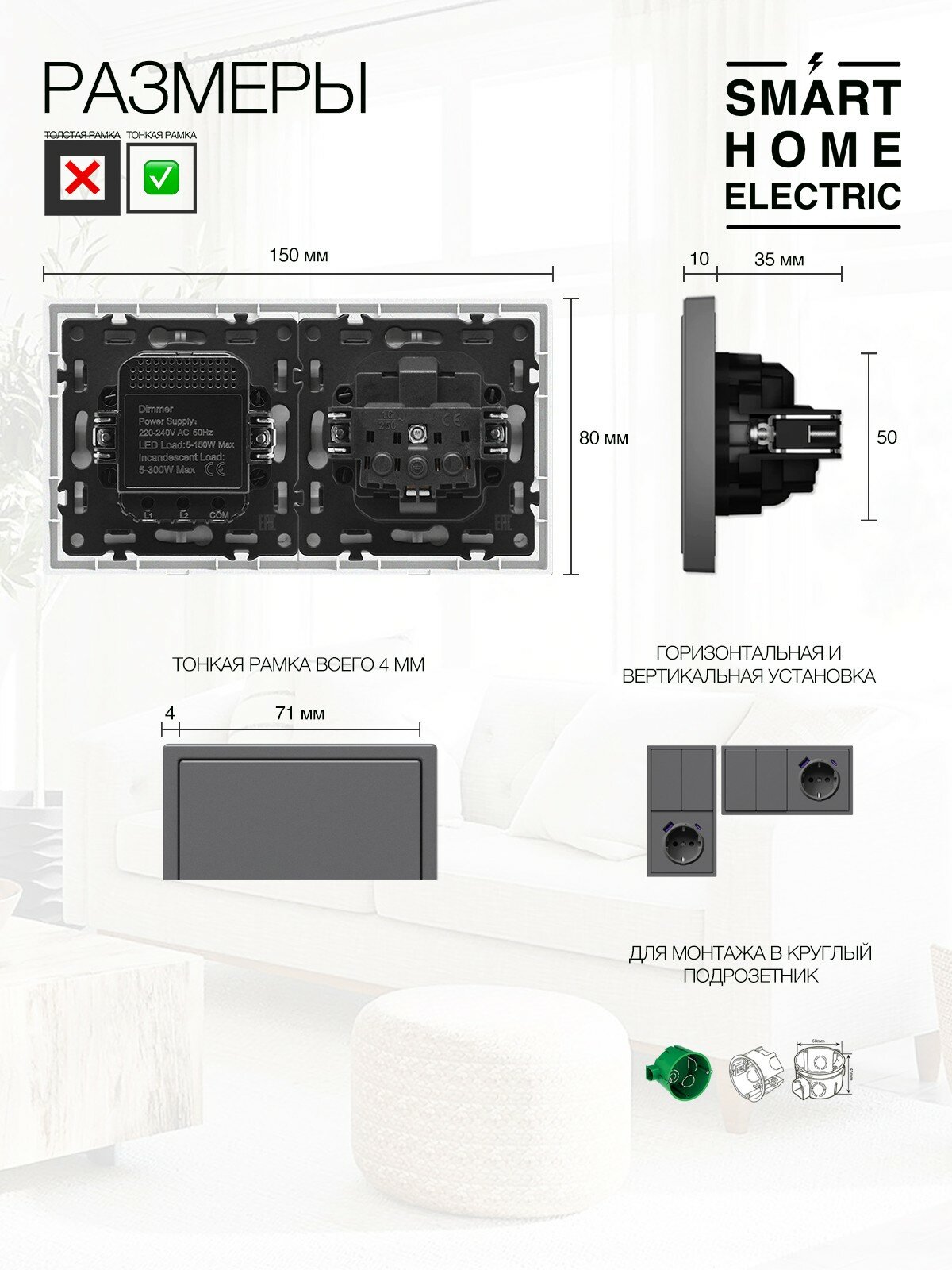 Одноклавишный механический выключатель с розеткой серого цвета. Надежный и недорогой регулятор света 220 вольт в современном дизайне. Это готовый комплект для установки, докупать ничего не нужно. Устанавливается в двойной стандартный круглый подрозетник. – Стильная тонкая рамка шириной 4мм отлично впишется в любой интерьер. Размеры 150 на 80 мм. Выпирает от стены всего на 10 мм. Матовое soft-touch покрытие, которого хочется касаться. – Блок электрической розетки с заземлением. Универсальная розетка на 16А. Оснащена защитными шторками от засовывания посторонних предметов детьми. – Блок механического выключателя . Большие и удобные клавиши отлично выглядят и имеют мягкий механизм переключения. Все остальные розетки и выключатели есть в наличии в нашем магазине