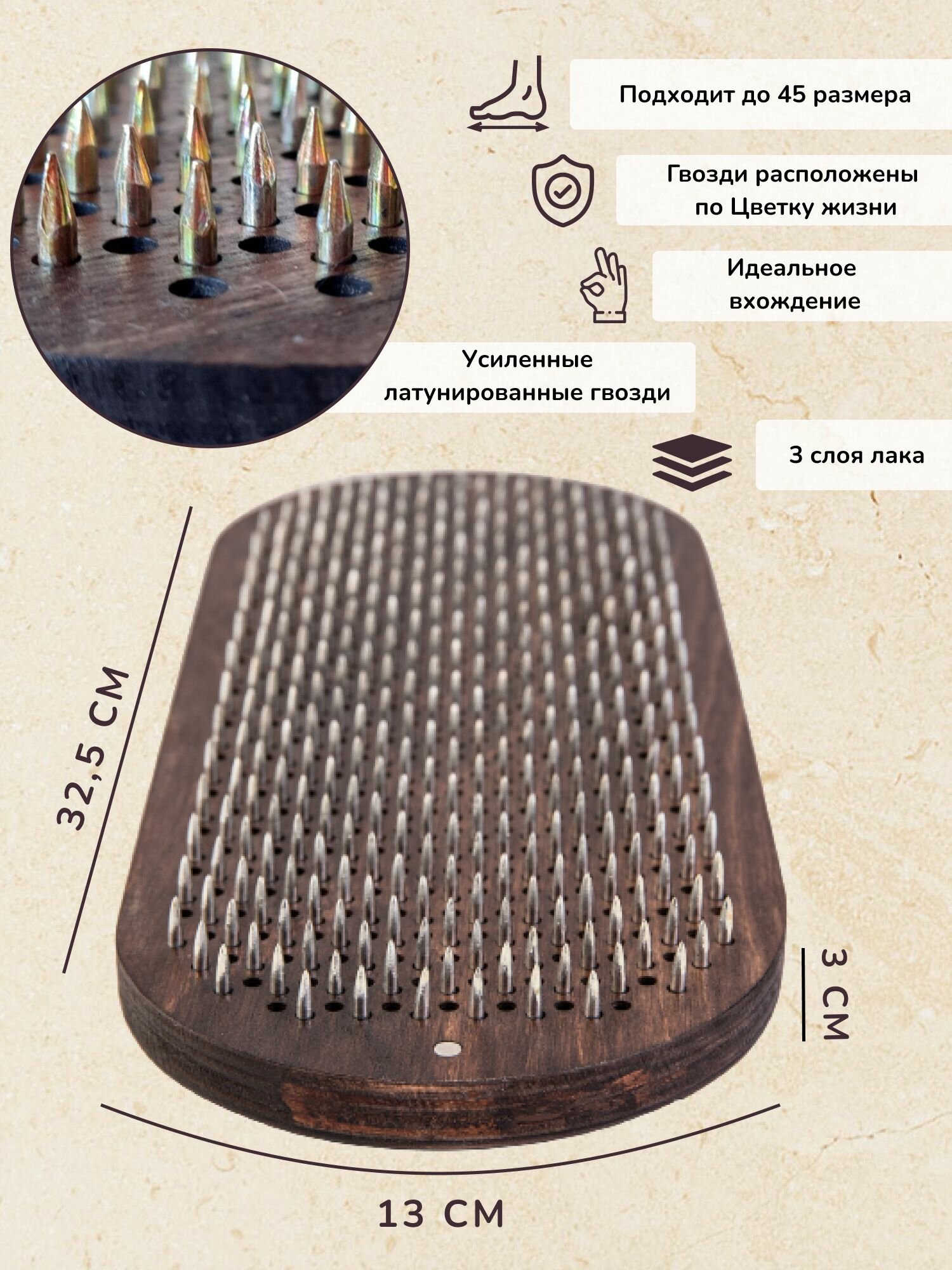 Гвозди на наших досках крепятся динамическим способом и имеют запас хода по вертикали до 3мм. Подвижные гвозди обеспечивают более мягкий вход в практику, что важно для начинающих практиков. Такие гвозди для ног подстраиваются по неровности ноги и прорабатывают максимальное количество акупунктурных точек, расположенных на стопе.